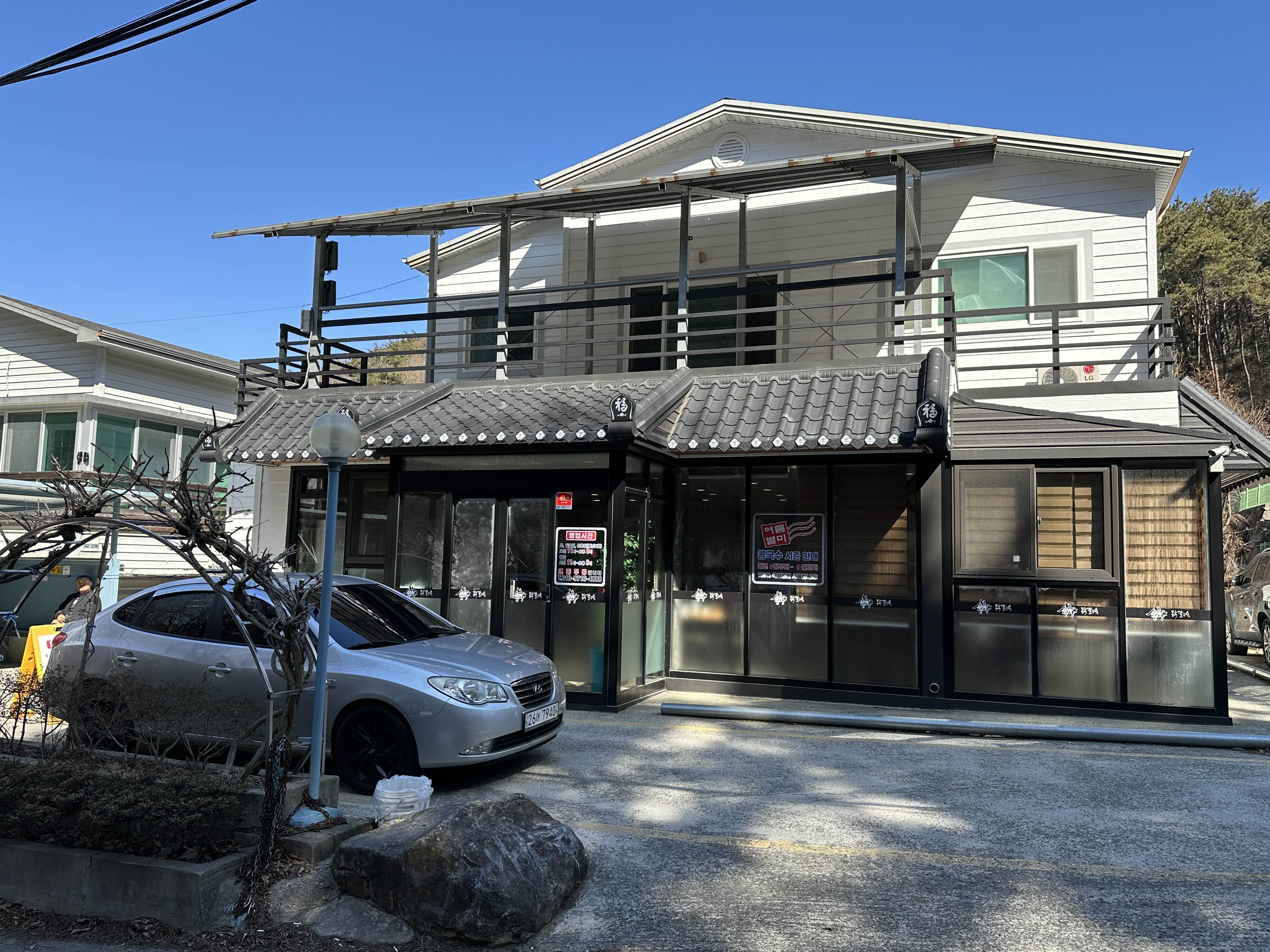 식당 전경입니다. 식당 우측에 주차공간과 입구에 공간이 있고 식당 주변으로 길가에 대시면 됩니다.
