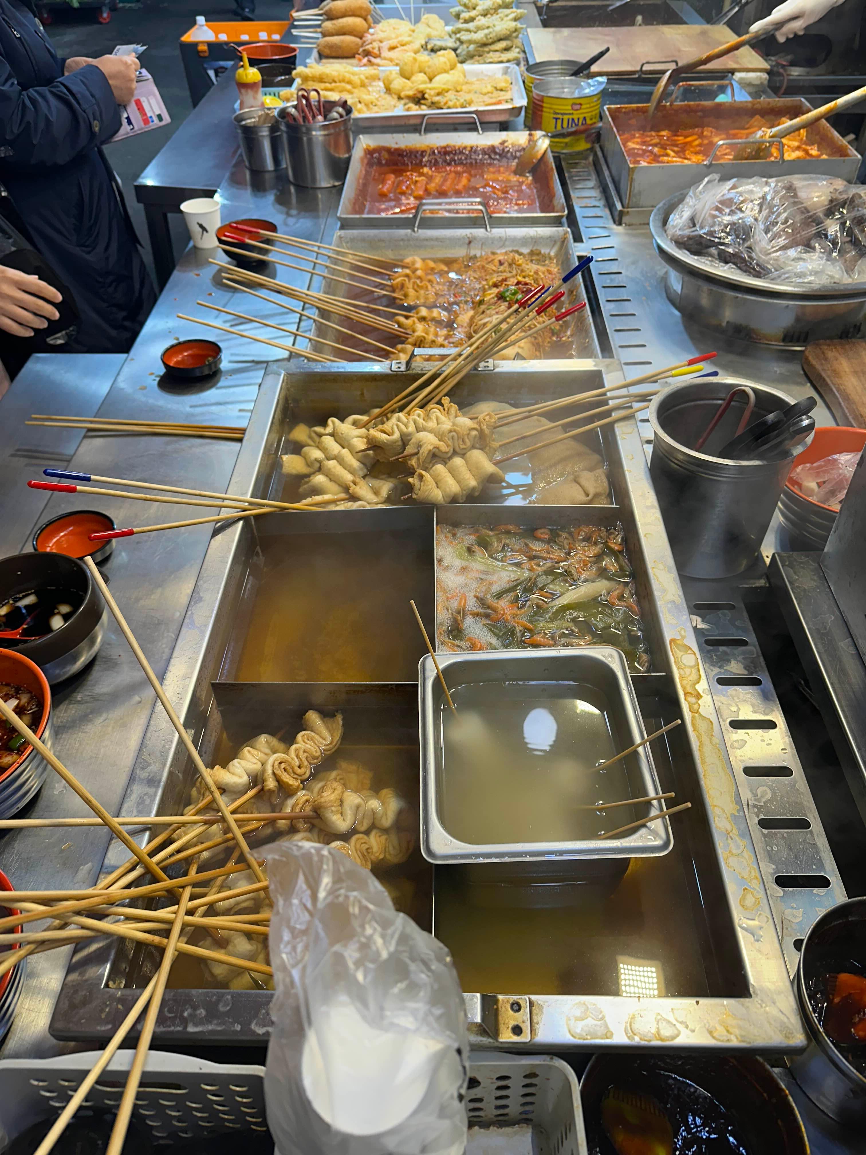 튀김은 모둠으로 시키면 5개(랜덤) 4,000원입니다. 낱개 주문 가능하고요 오징어 새우 고추 튀김음 1,000원 김말이 같은 건 800원입니다. 바로바로 해서 먹으니 더 맛있는데 겨울이라 그런지 좌판에 나와 있는 것은 좀 식었더라고요 ㅠㅠ