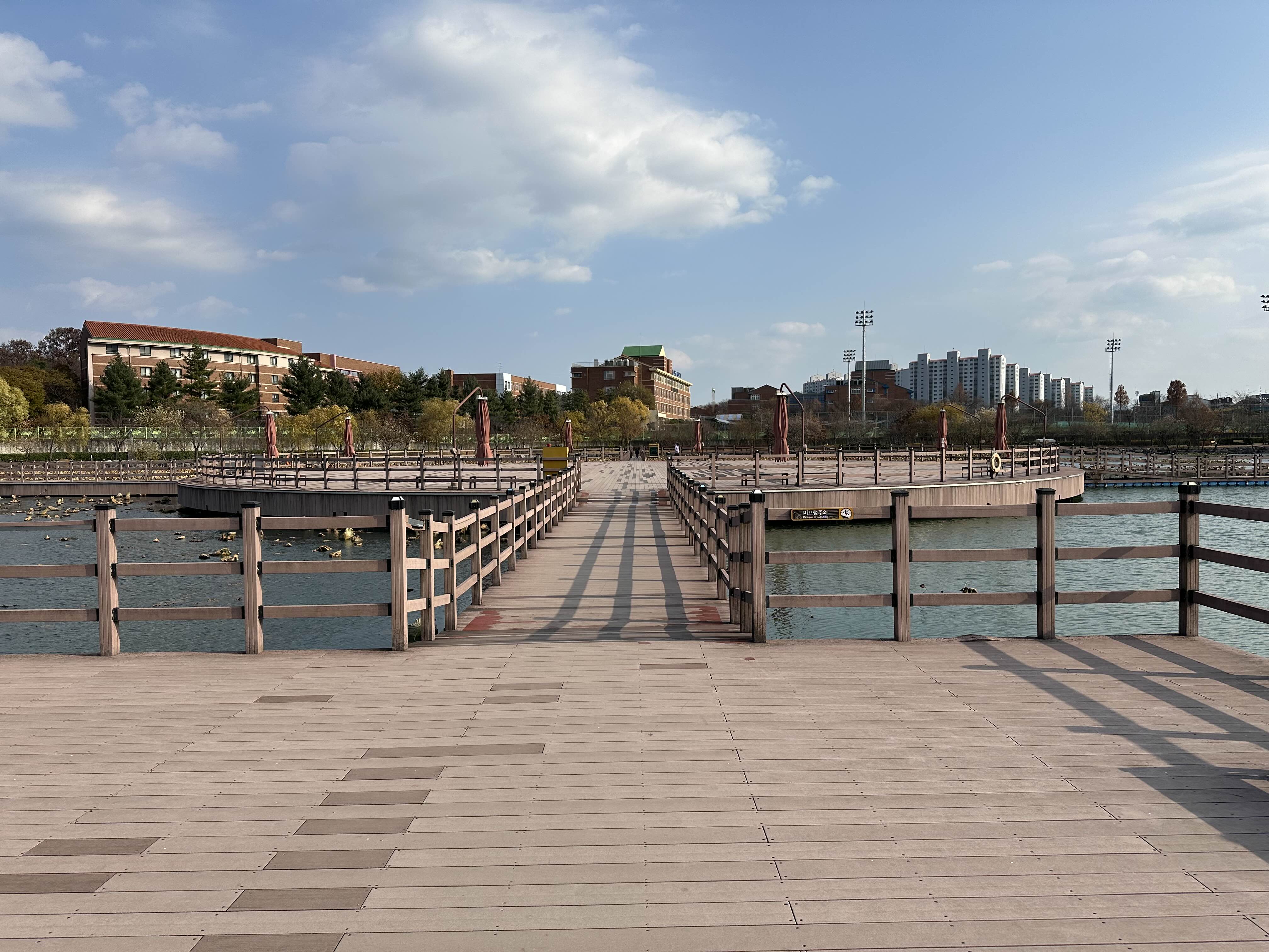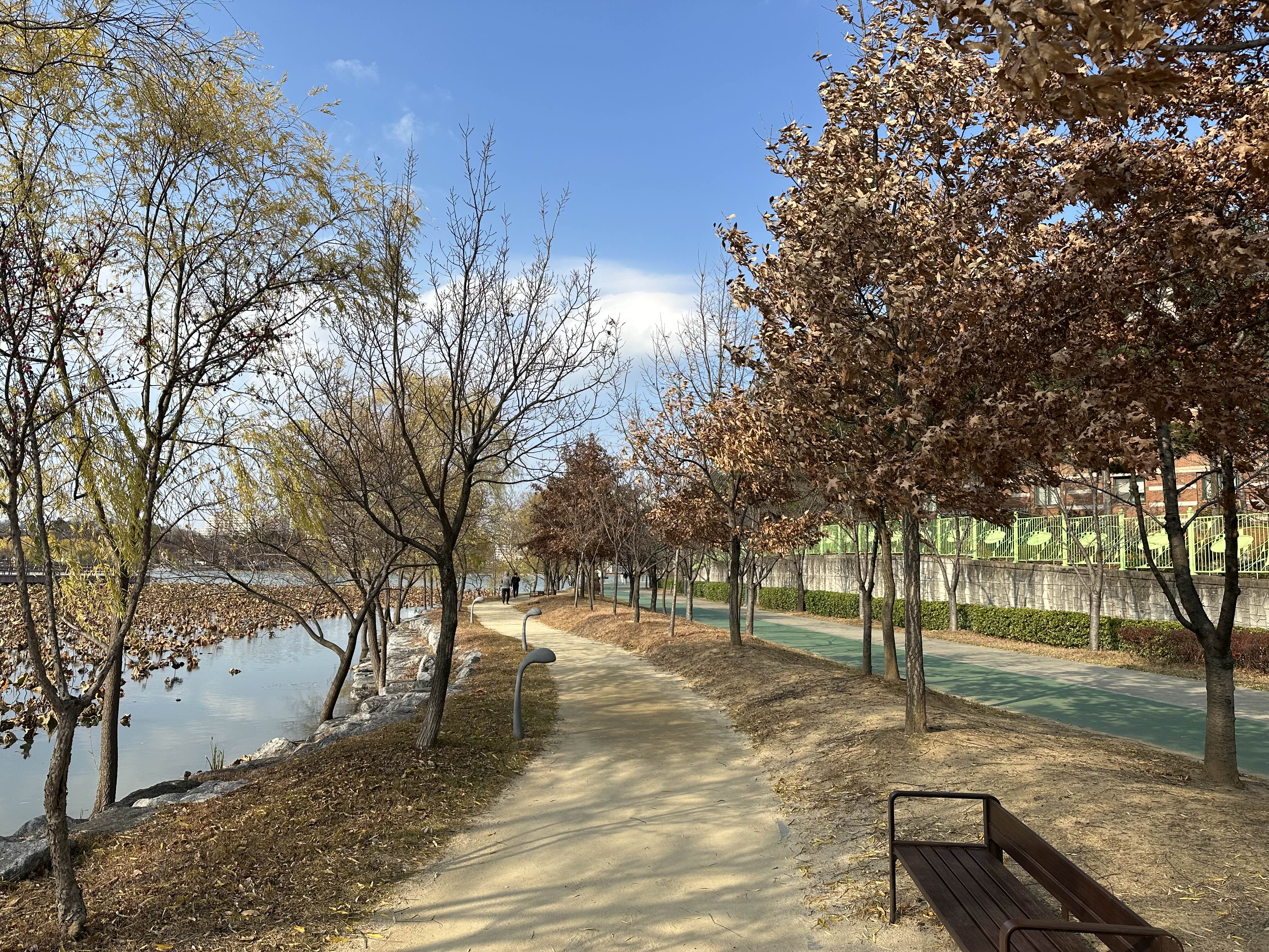 데크길을 통해 남매지를 횡단하면 주변에 둘레길이 있습니다 흙바닥도 있고 트랙도 있습니다 주민들은 맨발 걷기도 하시고 주변애 러닝 하시는 분들도 있습니다 조만간 저도 한번 달려야겠습니다