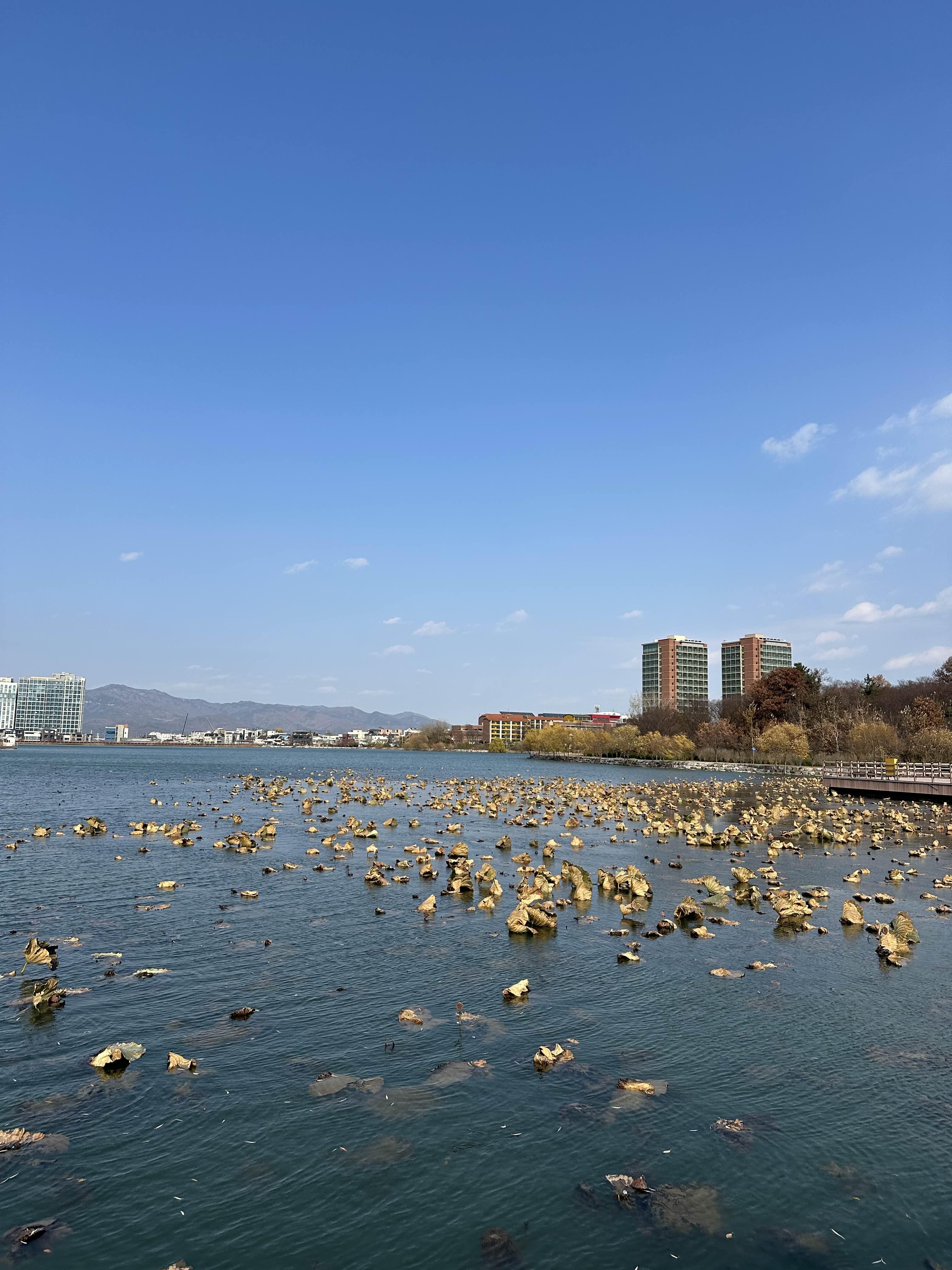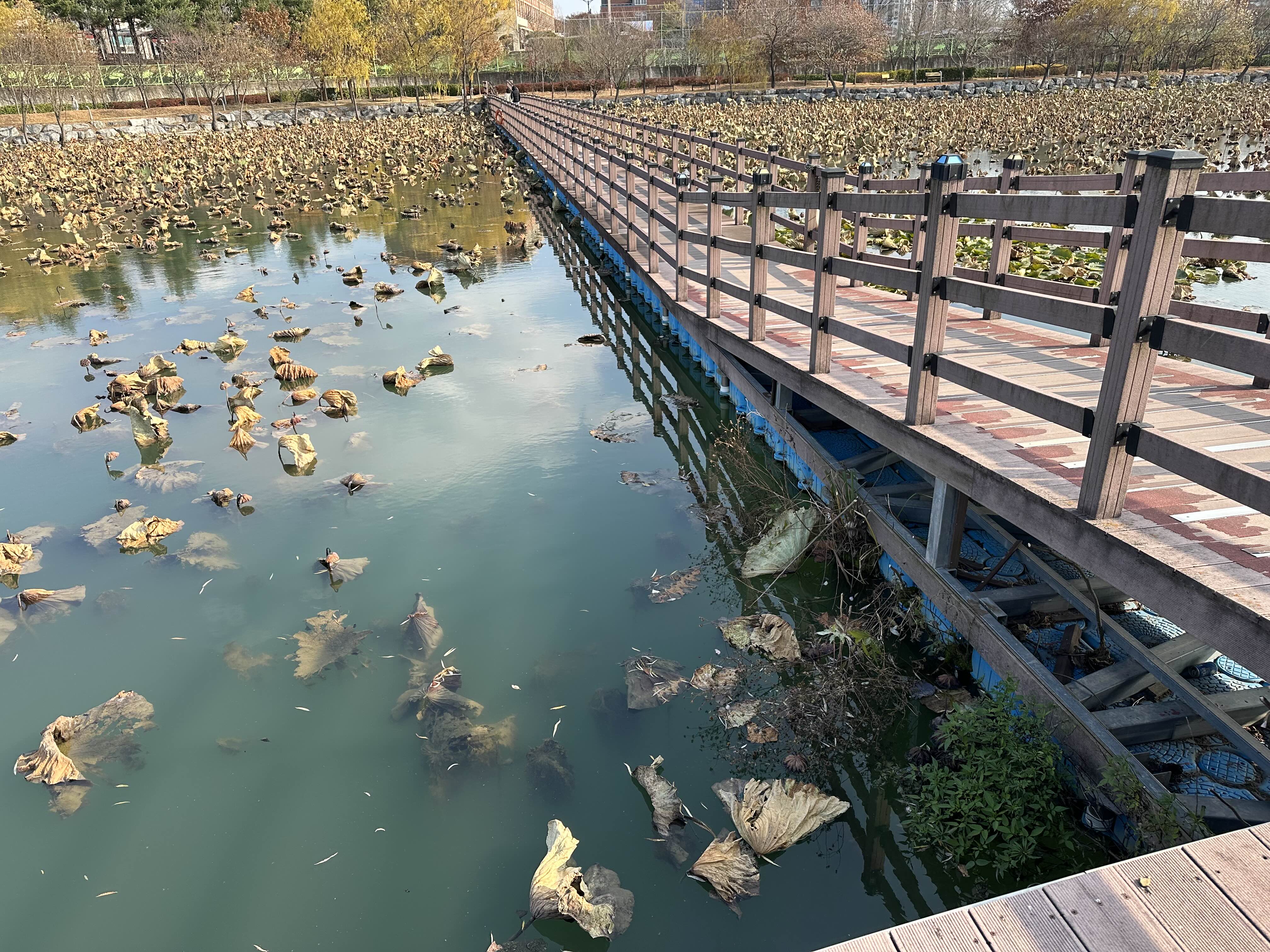 물속에는 올해 자랐던 연꽃이 잠시 휴식기애 들어간 거 같습니다 연꽃이 피었을 때 엄청 예쁠 것 같습니다 그래도 시든 연꽃잎들을 보며 겨울 정취를 느낄 수 있습니다