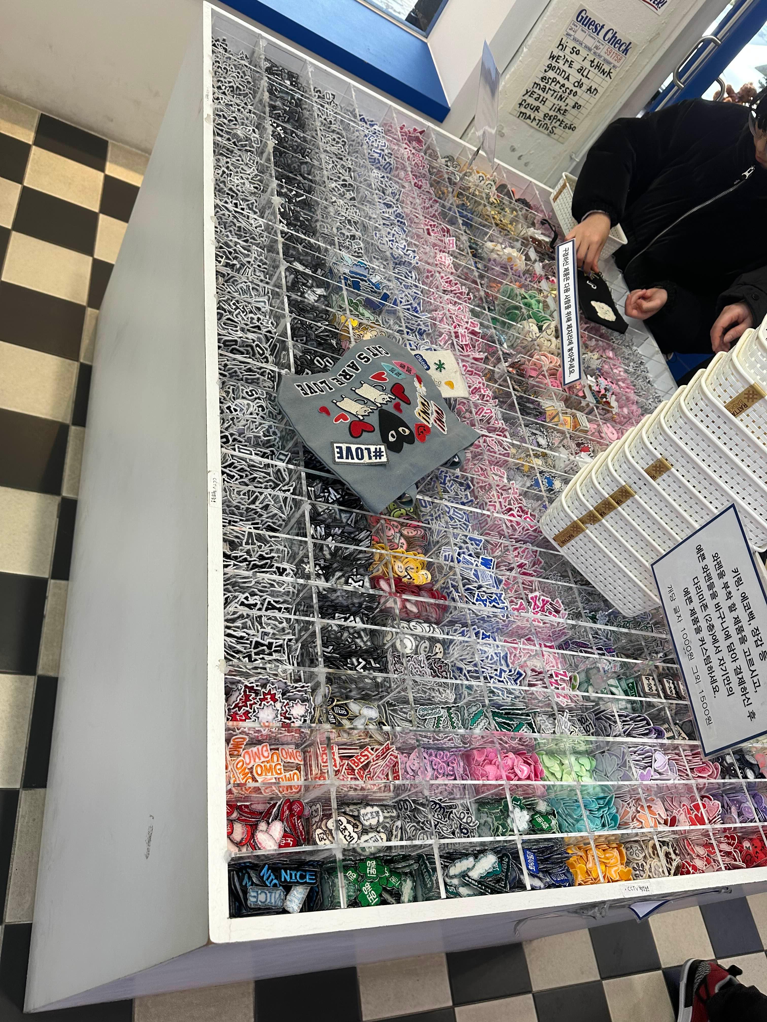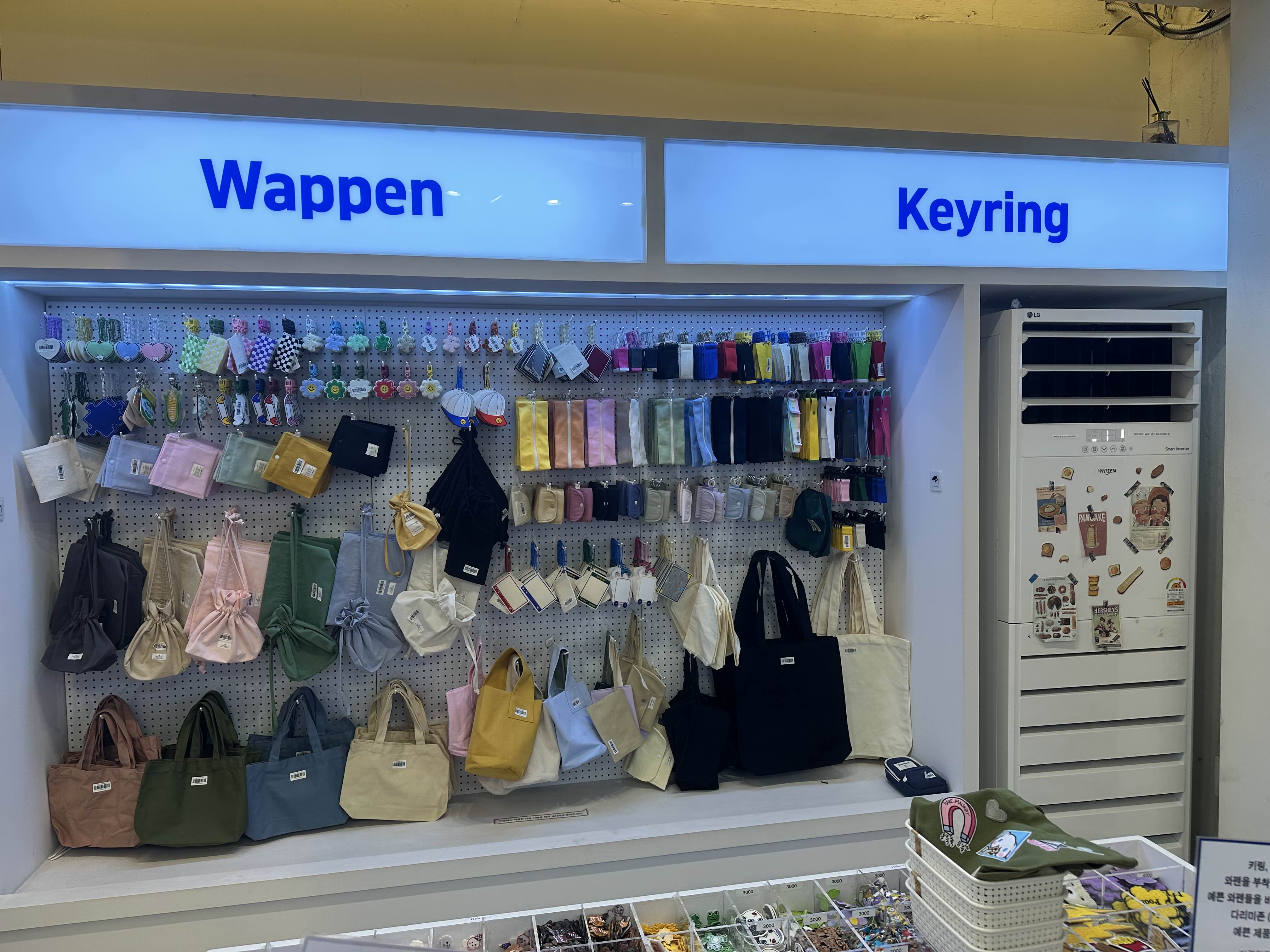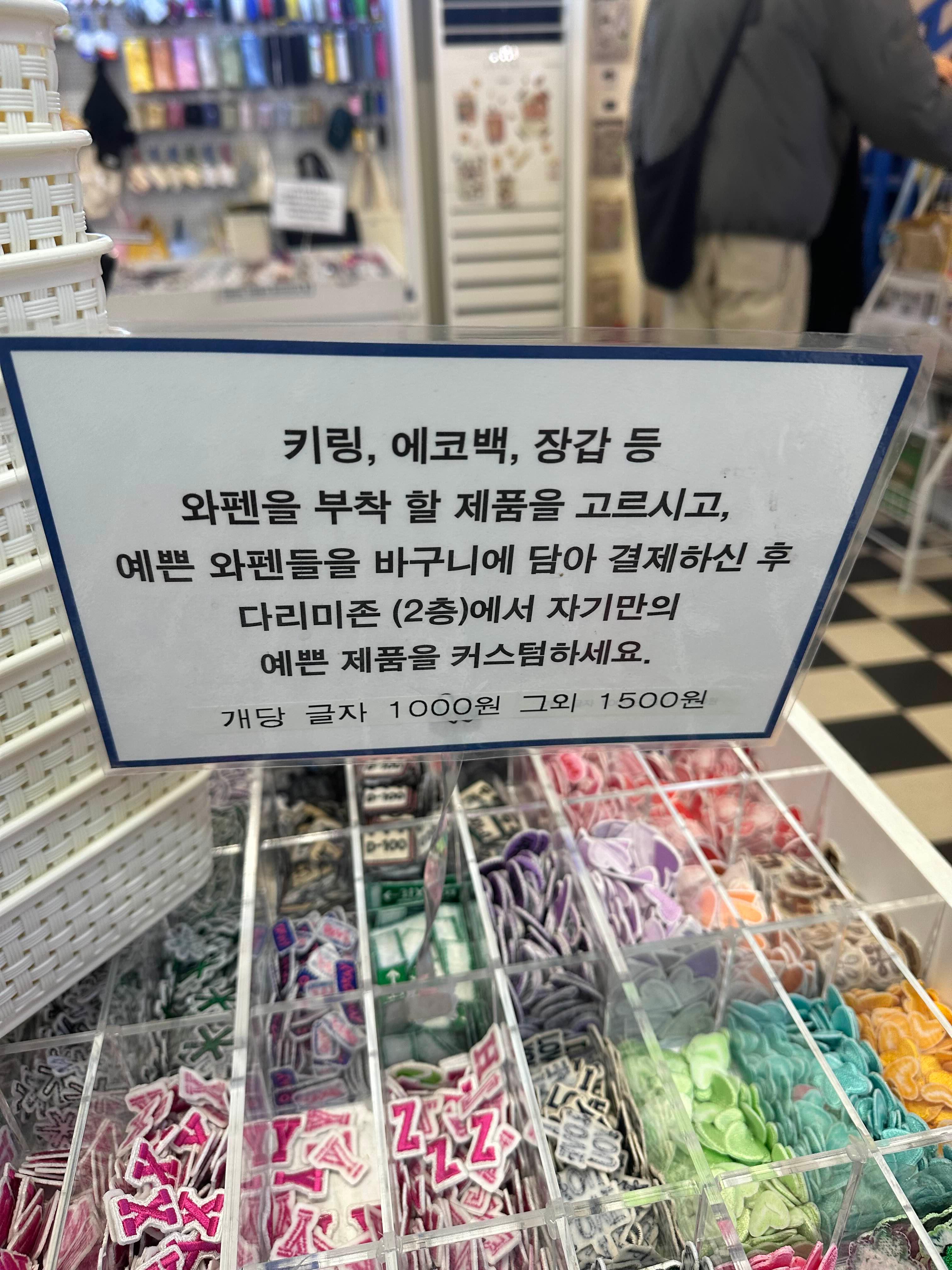 내부에는 여러 가지 소품들이 있습니다 DIY로 가방 지갑 필통 같은 거를 꾸미는 건데요 와펜이라는 거 사서 다리미로 눌러서 나만의 소품을 만드는 겁니다