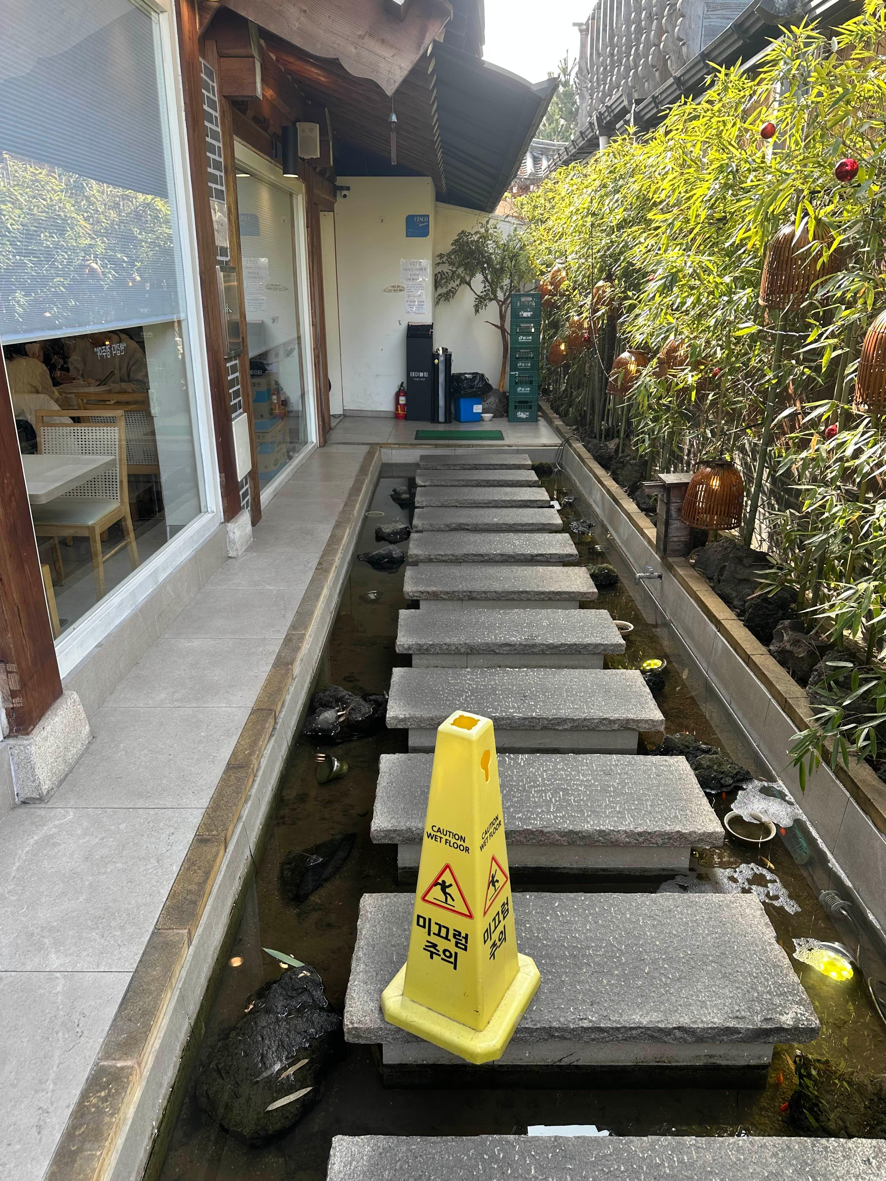입구로 들어가면 징검다리가 있습니다 징검다리 밑에는 물이 있고요 금붕어와 작은 물고기들이 있어서 아이들이 좋아할 만합니다