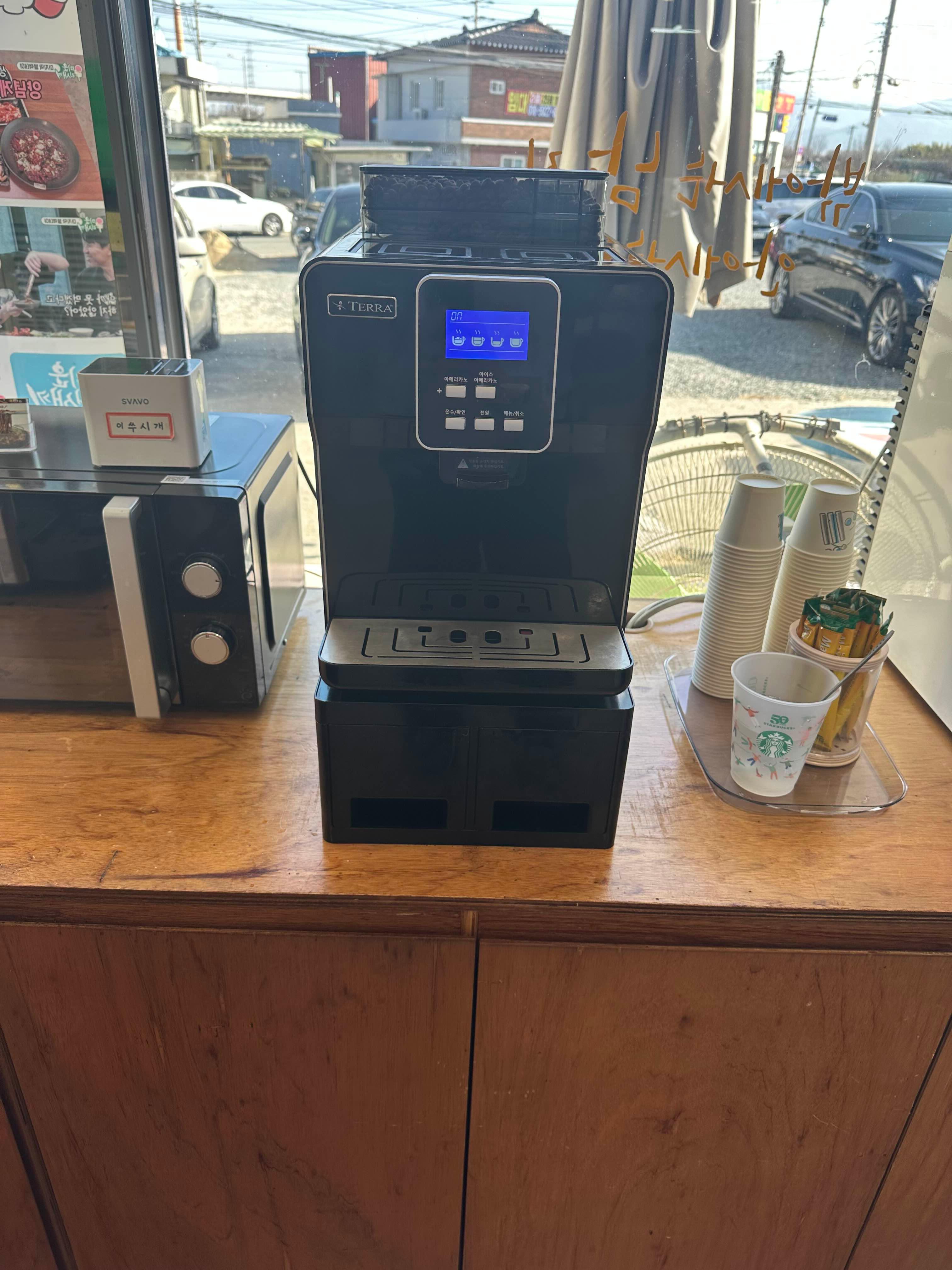 돌짜장 드시고 후식이 생각 나시죠?? 먼저 커피 머신입니다 옆에 얼음 냉장고도 있어서 아아 도 가능 합니다