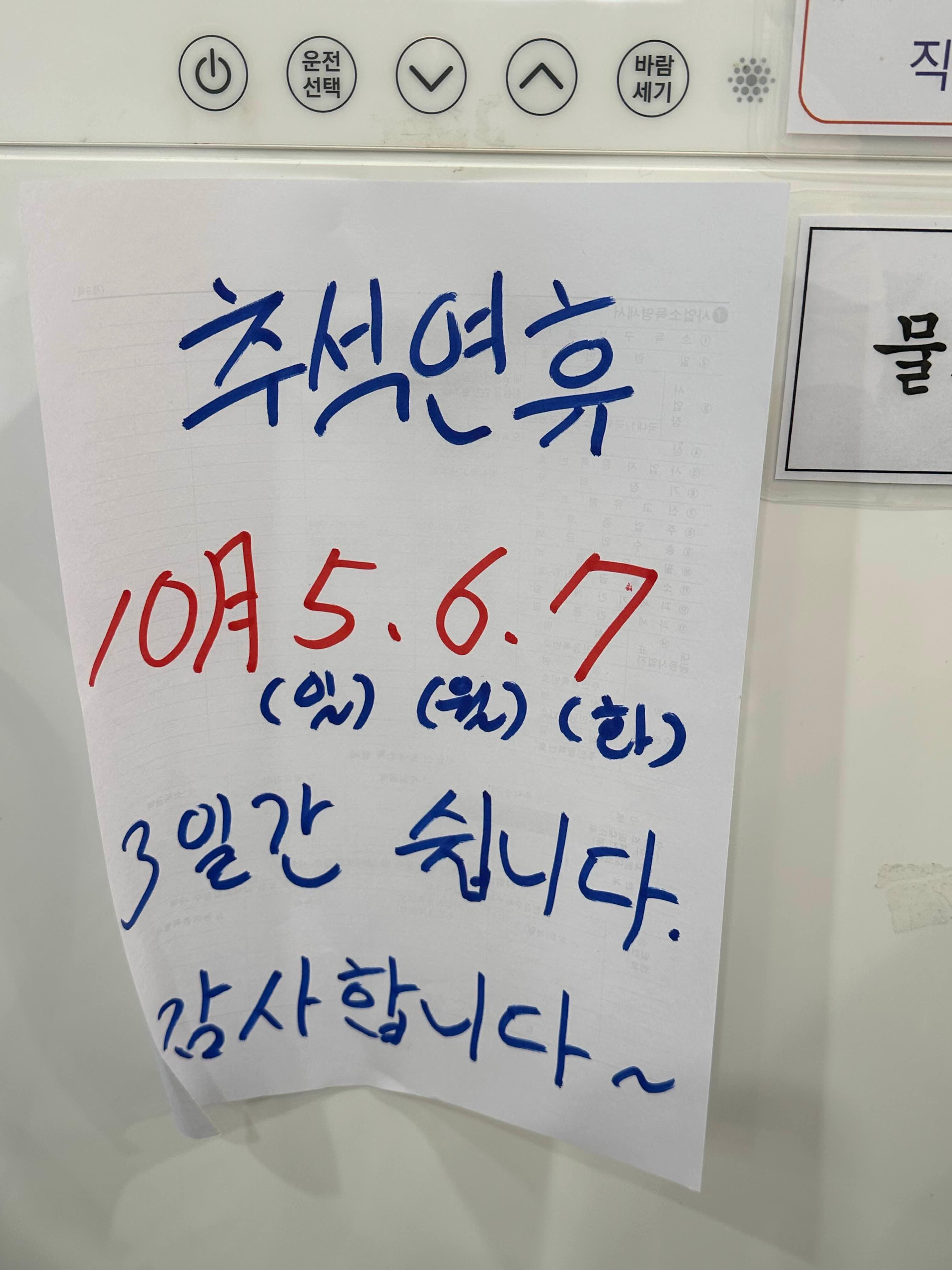 추석연휴 때 10/5,(일), 6,(월), 7(화)까지 3일간 쉰다고 식당에 붙어 있었습니다 추석 연휴 방문 하실 분들은 참고하세요