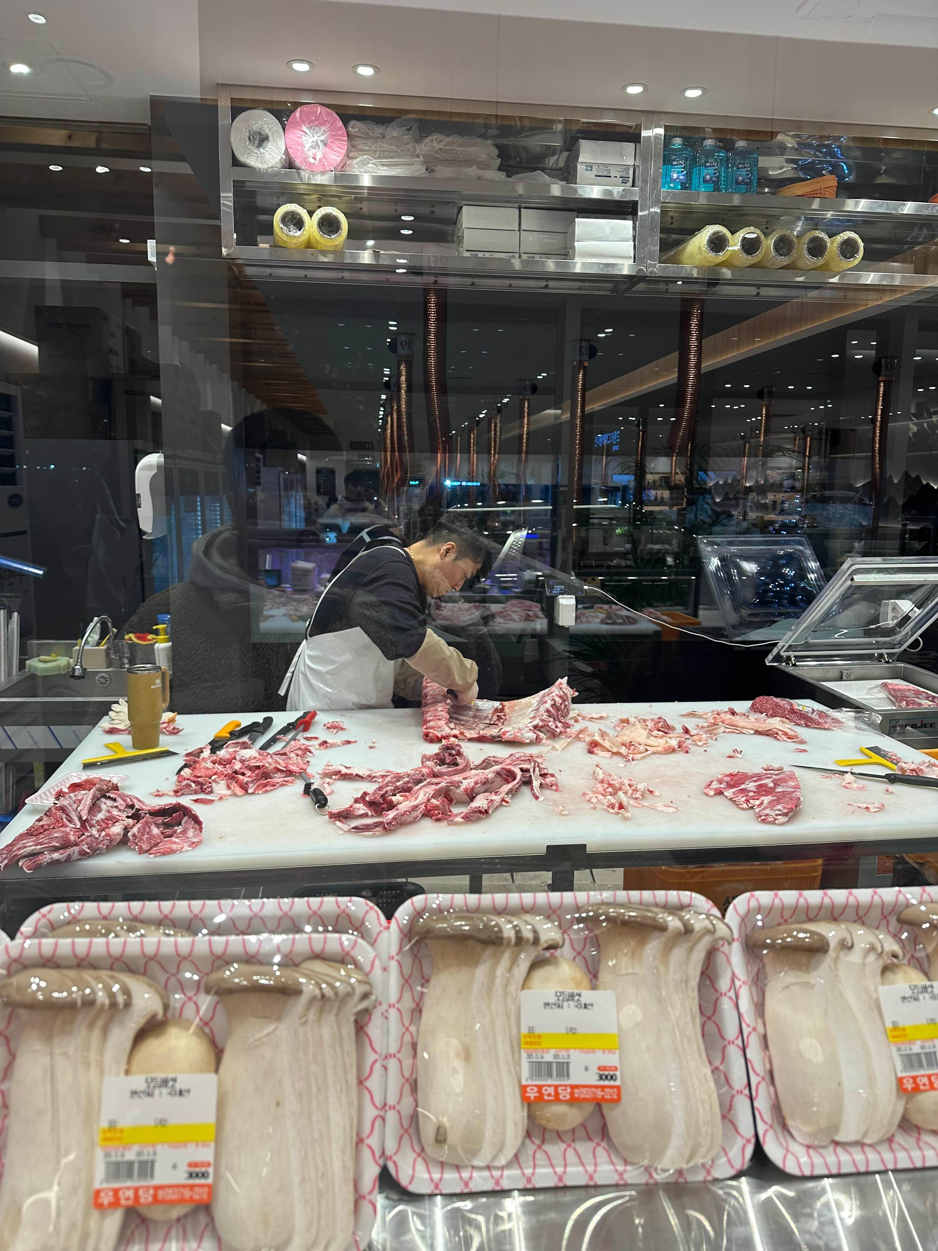 식육점에서 고기를 손질하고 있는 모습입니다 고기 손질하는 모습을 오픈했다는 것은 고기의 질과 과장의 청결함에 자신 있다는 거거든요 ㅎㅎ
