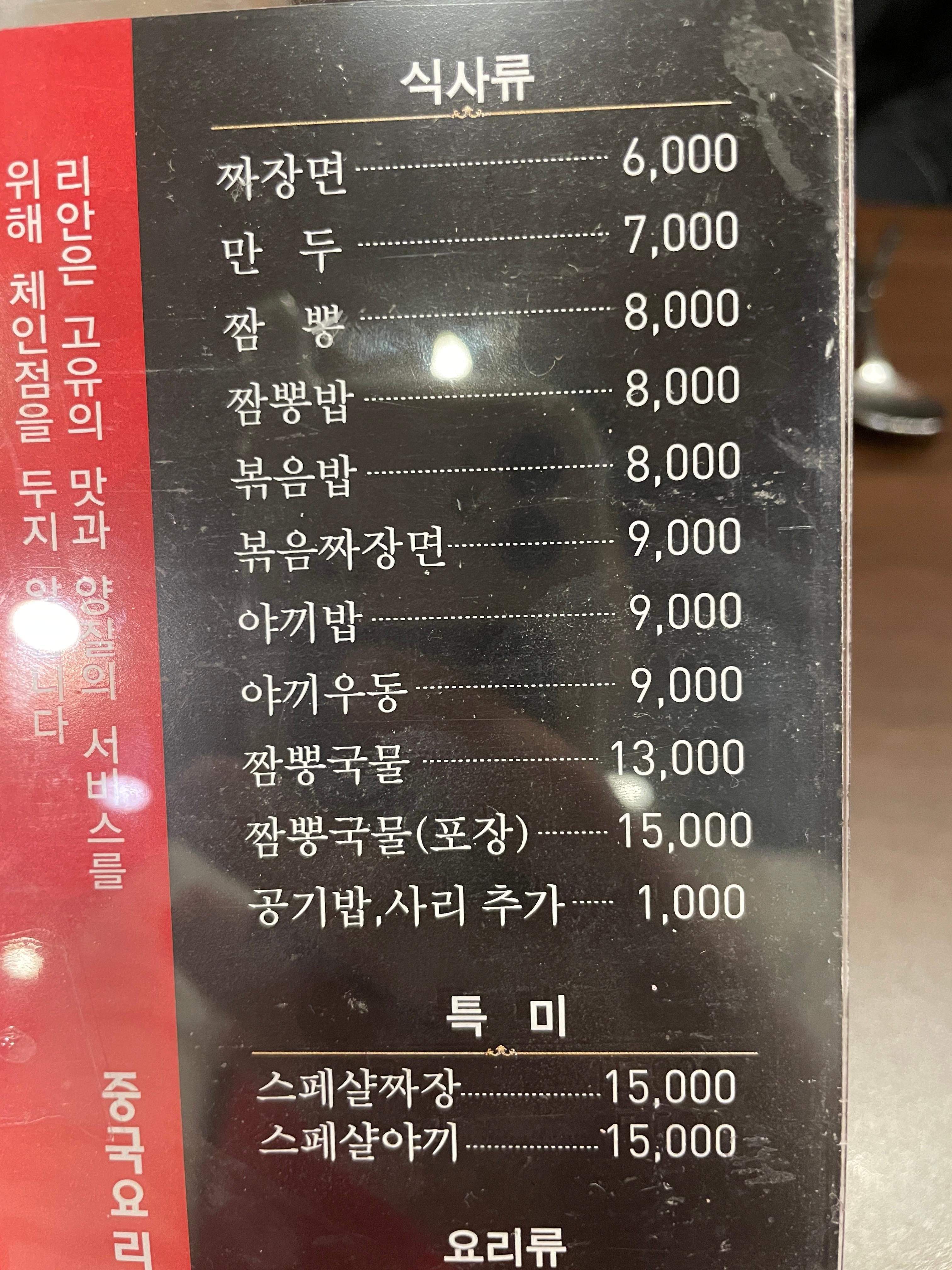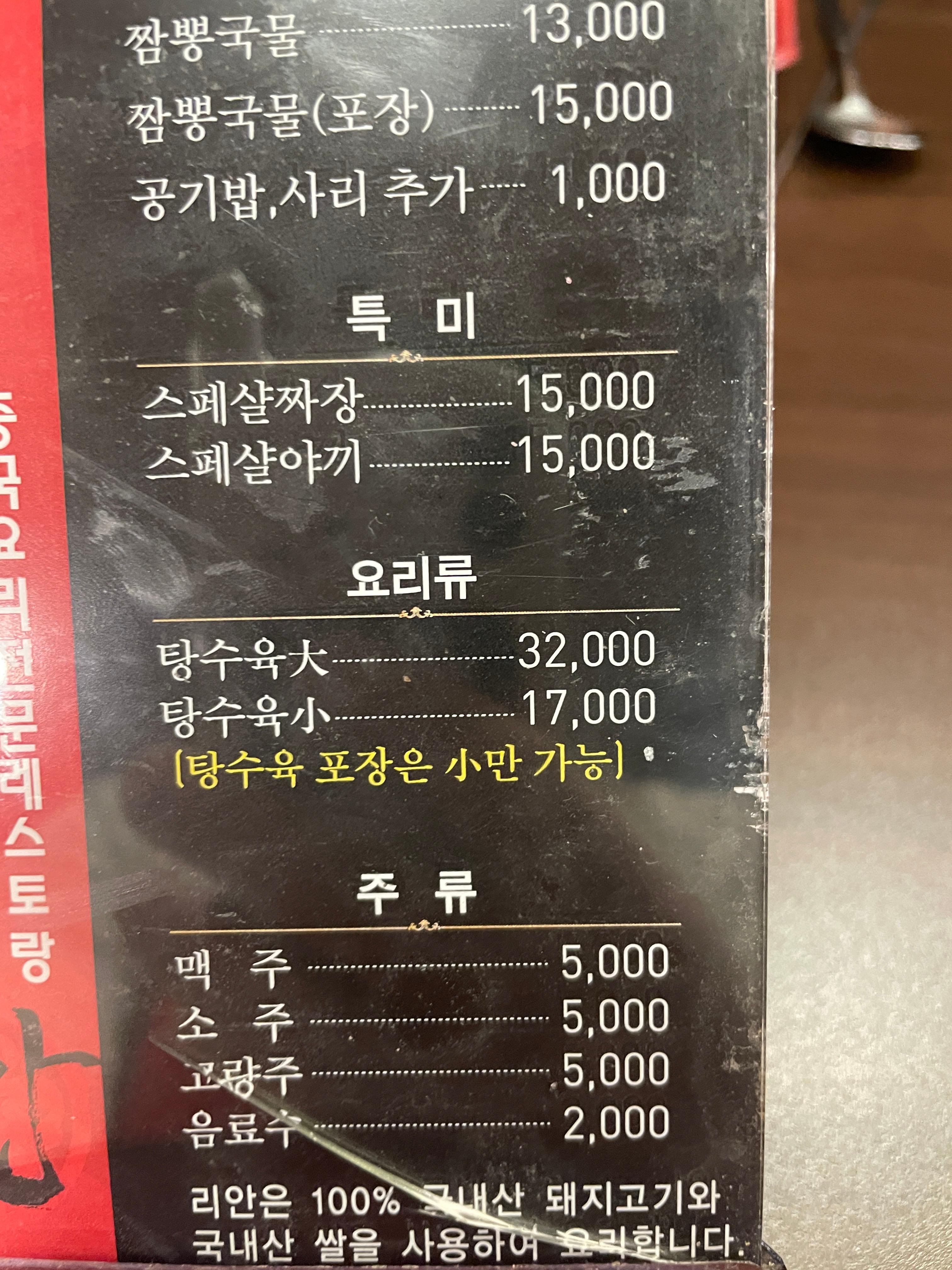 메뉴판입니다. 저희는 짬뽕, 스페셜야끼, 탕수육 소 주문 했습니다