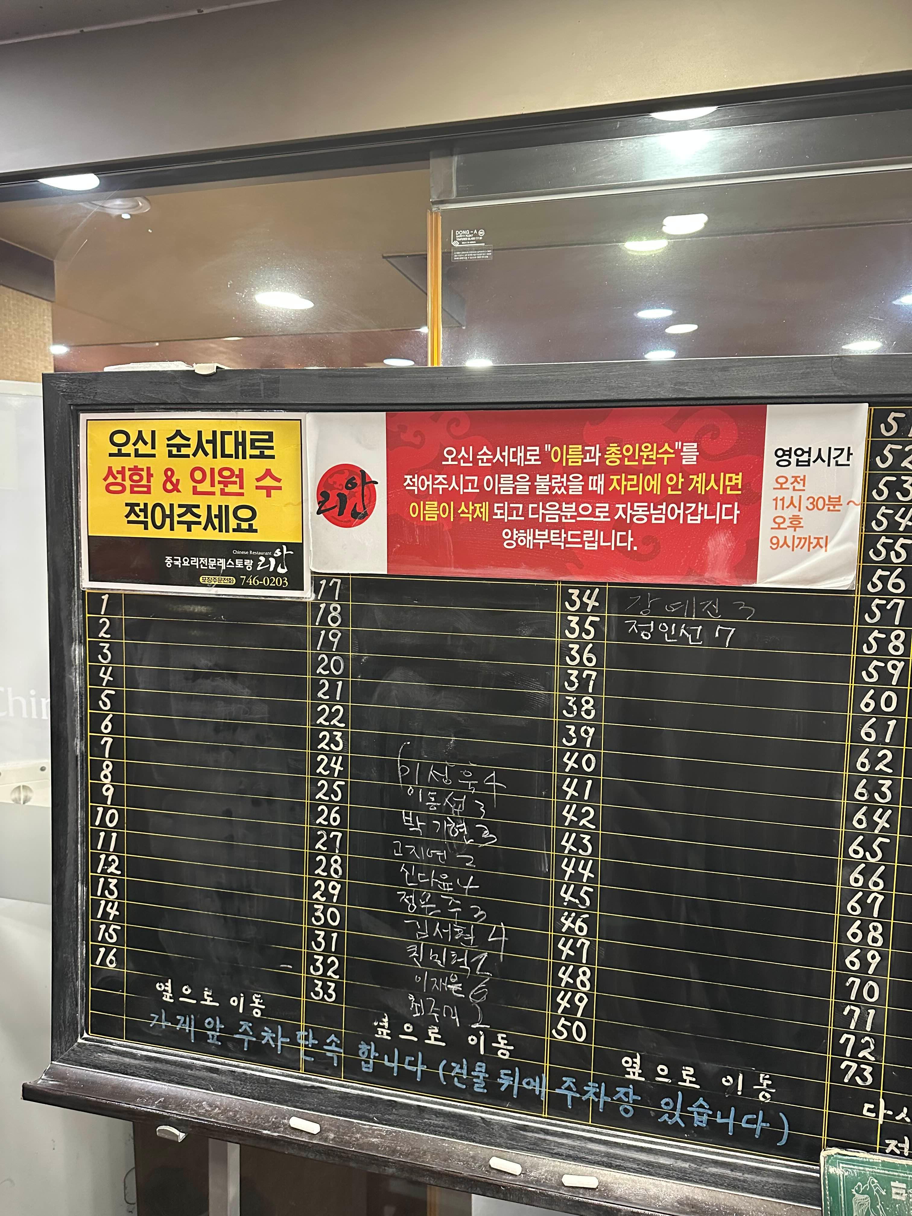 오시면 칠판에 분필로 이름과 명수를 적어줍니다. 오랜만에 분필 만져보네요 ㅎㅎ 순서 되었는데 자리 안 계시면 삭제 후 넘어가네요.. 살벌 그 자체..