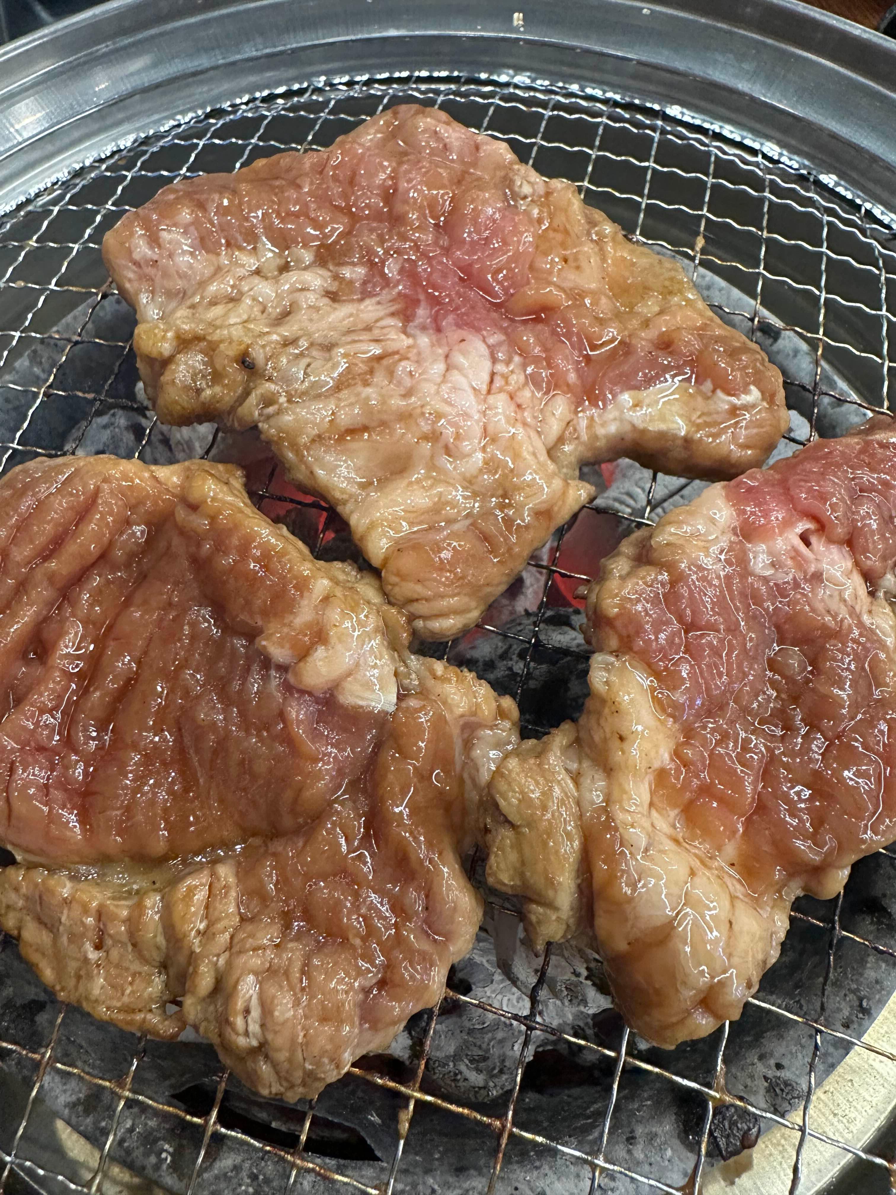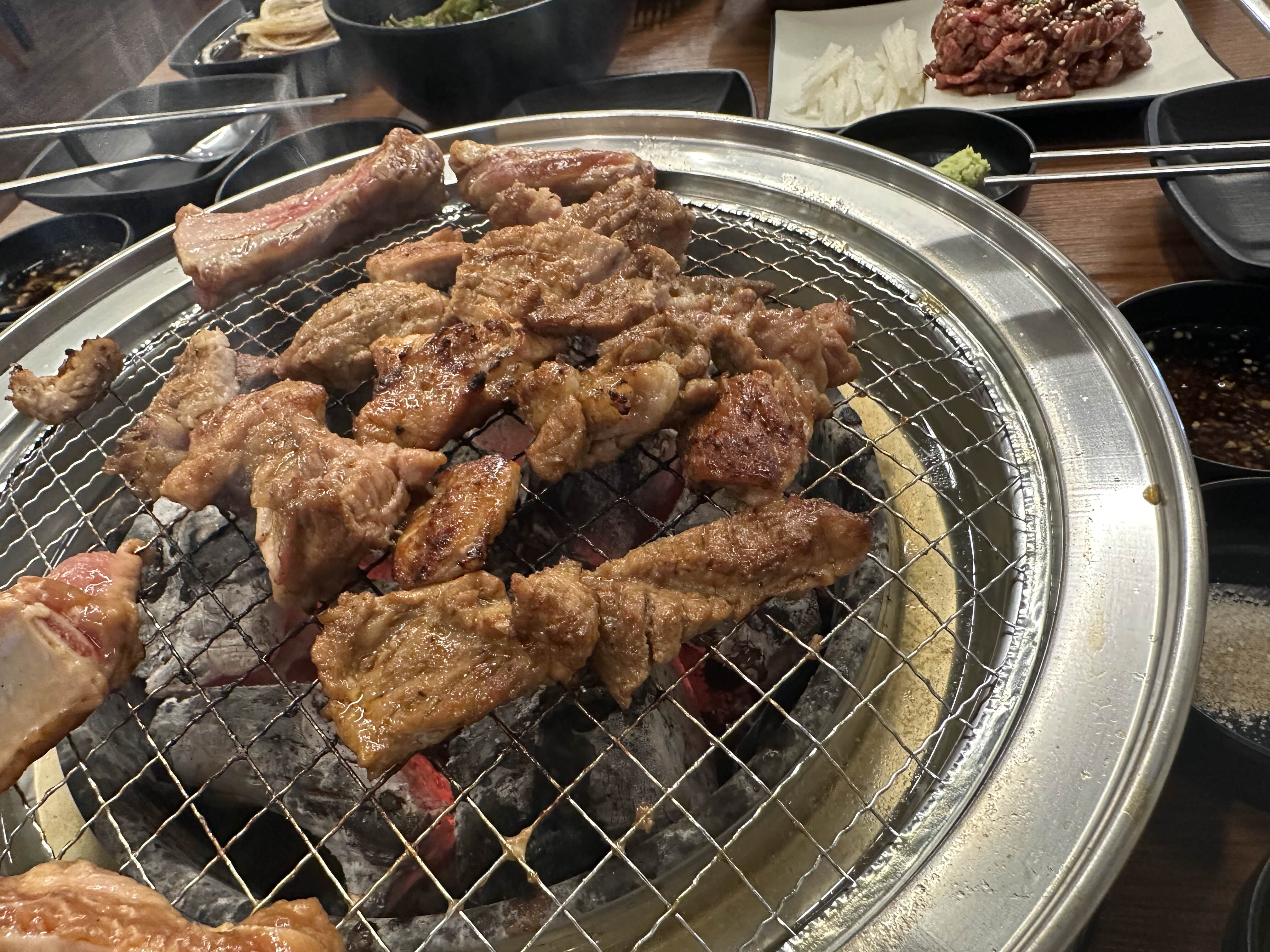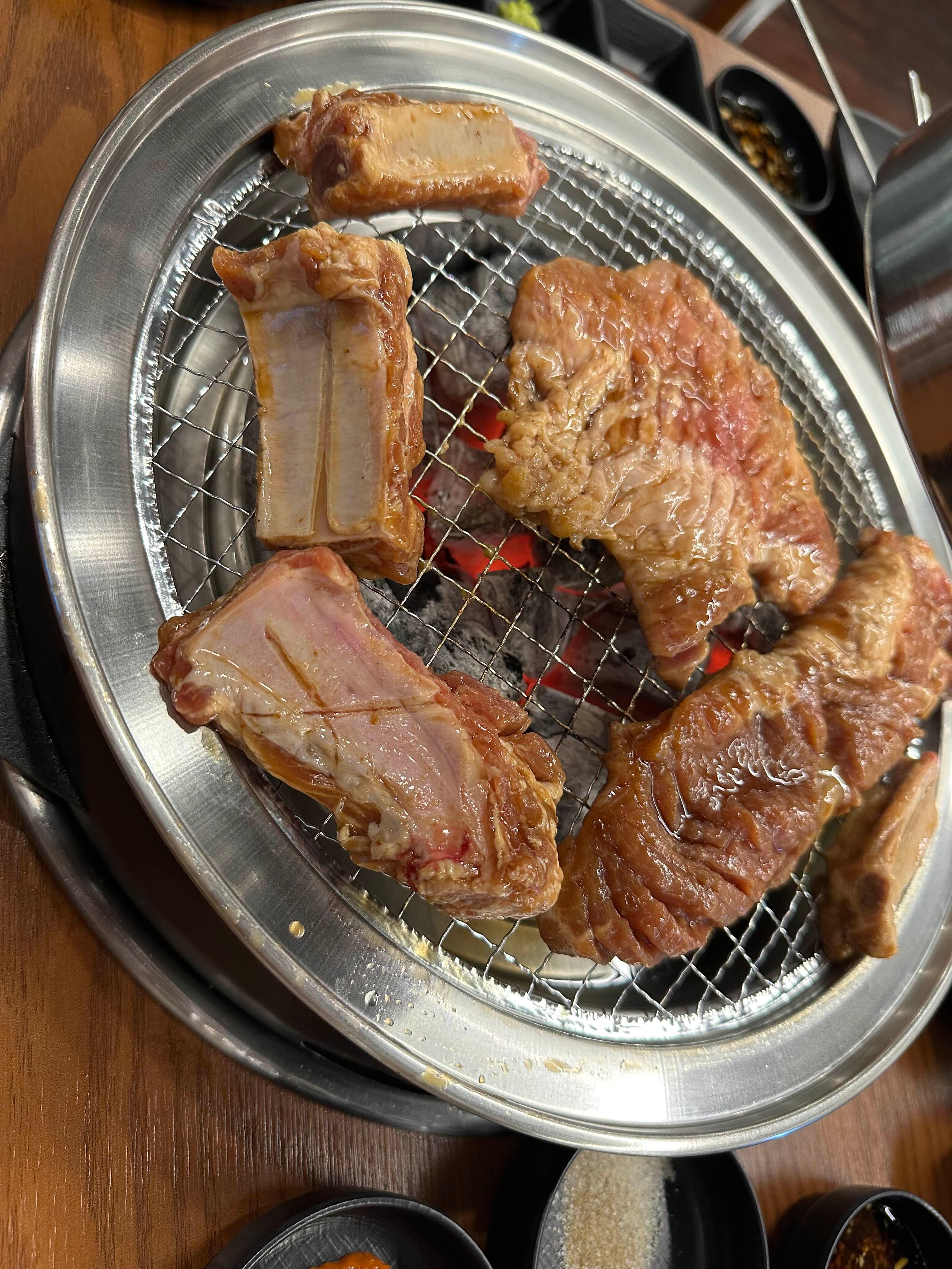 우선 두덩이(한 덩이는 길어서 반자름)를 숯불에 올렸습니다 기름이 곳곳에 붙어 있는 걸 보니 갈비부위가 맞는 것 같습니다
