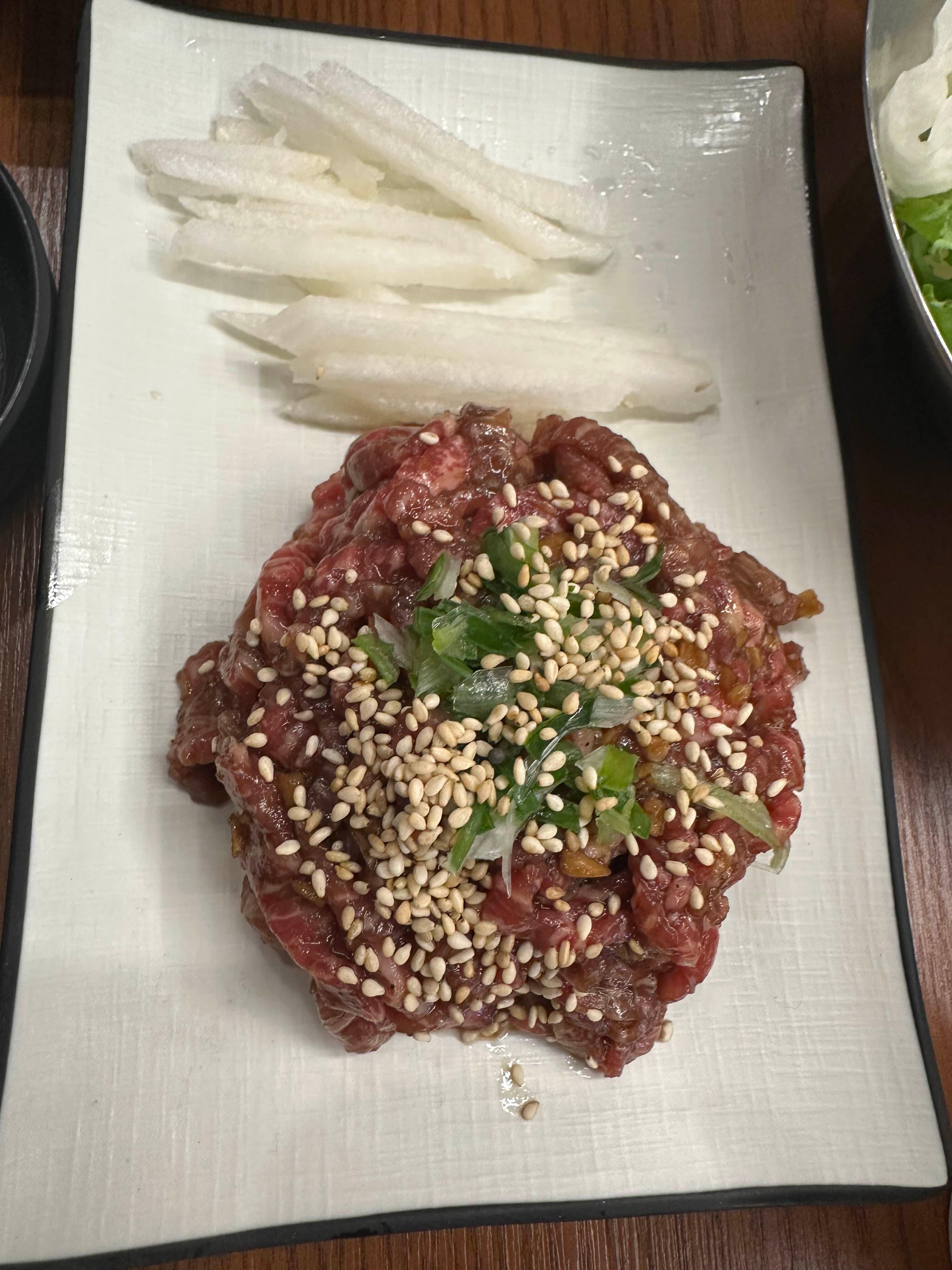 사이드로 시킨 육회 한 접시 ㅎㅎ 참기름의 고소함과 간장의 짭조름함과 마늘향이 살짝 느껴져서 맛있었습니다