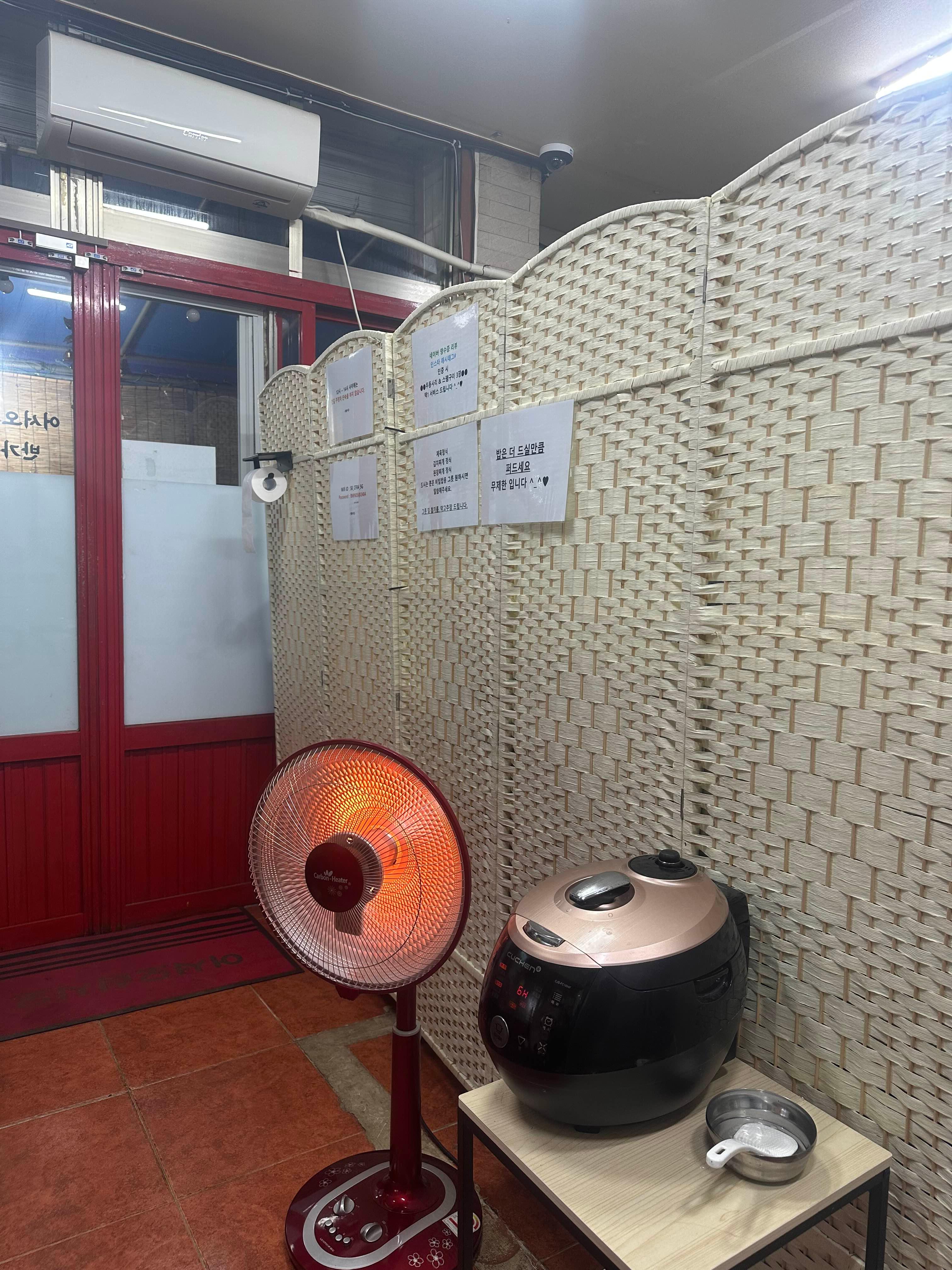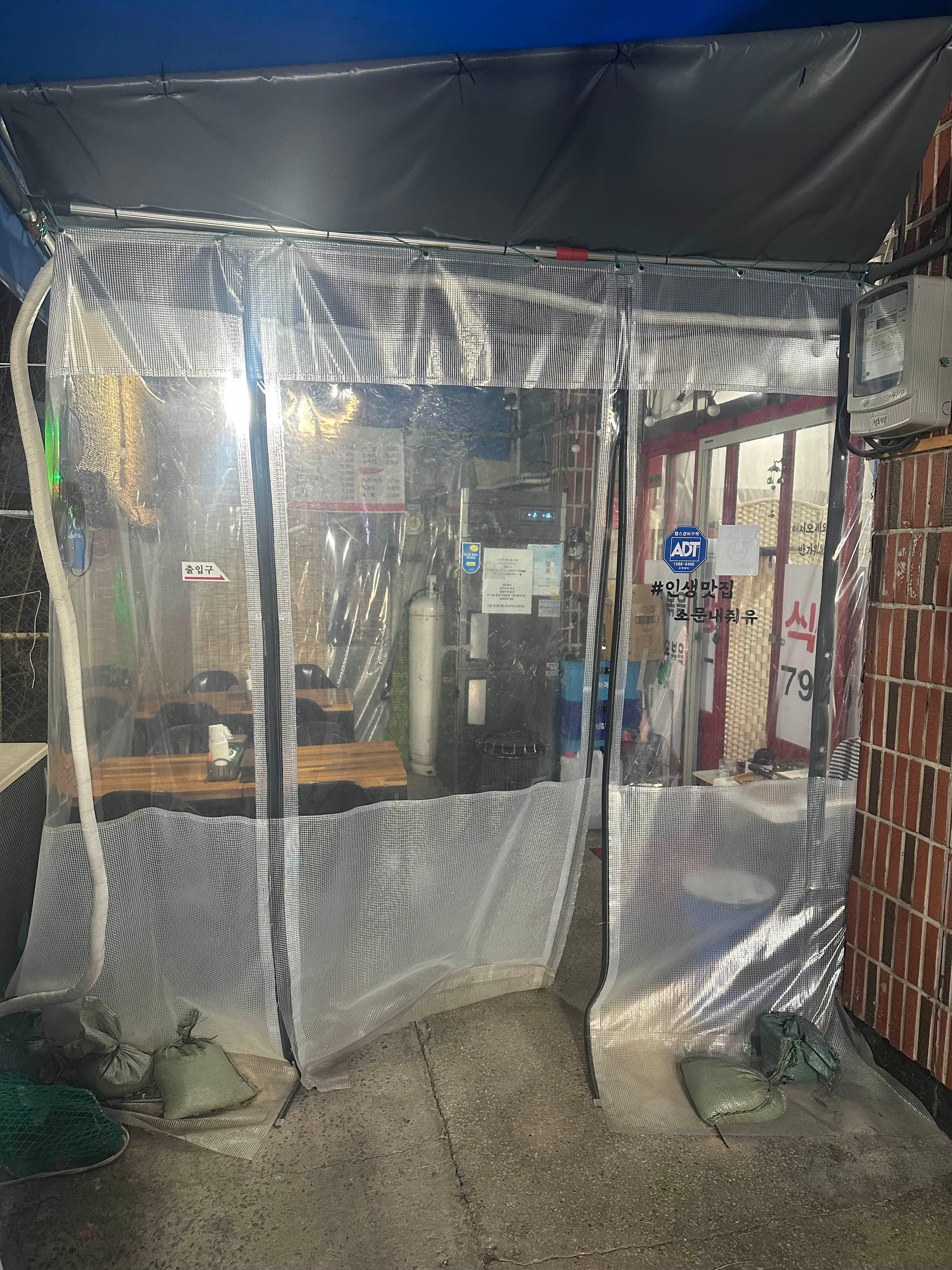 비닐로 된 문을 열고 들어가면... 실외 테이블이 2개가 있고요.. 겨울철이라 석유난로가 있어서 춥지 않게 식사 가능할 것 같습니다.