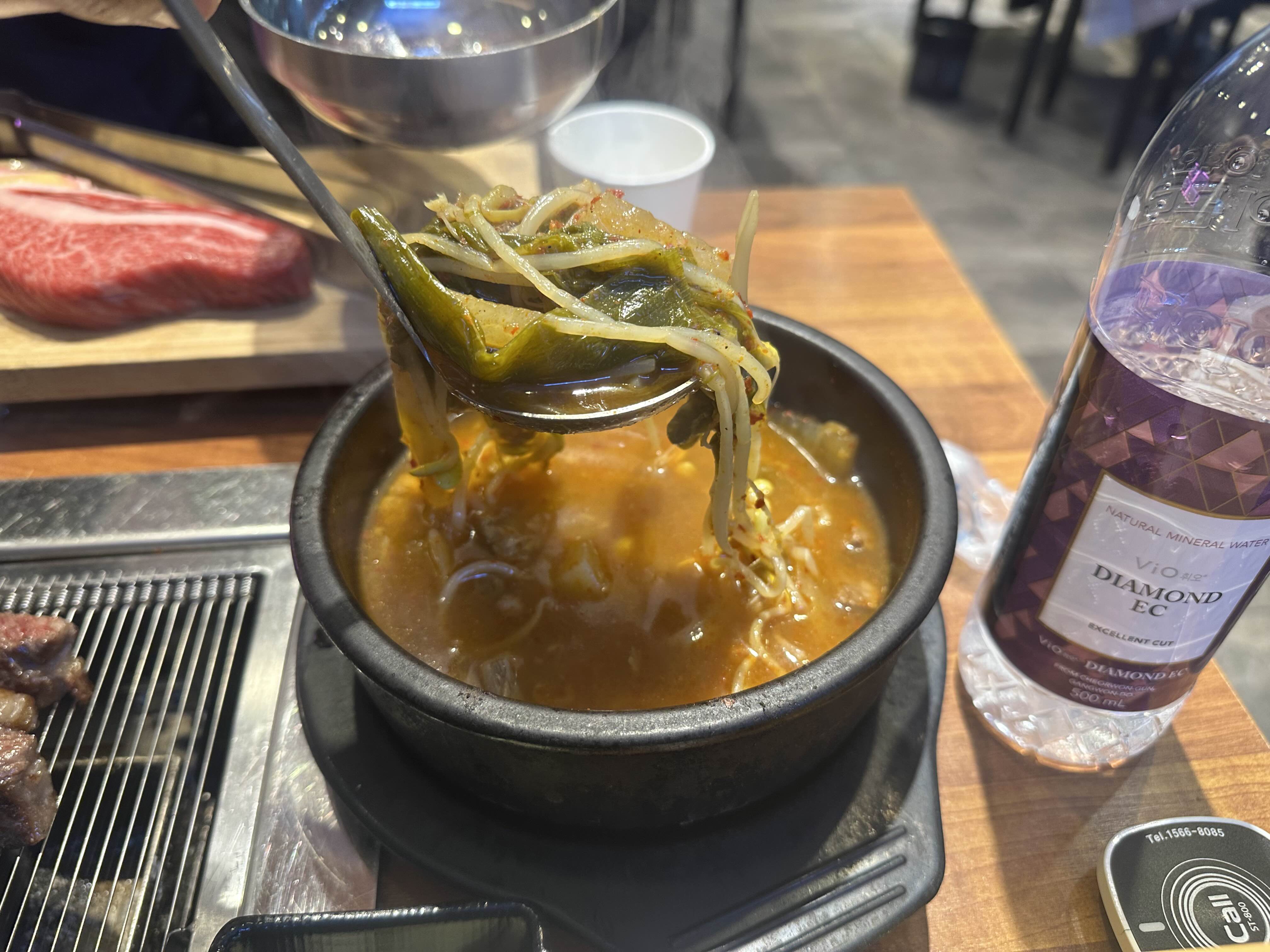 이것은 서비스로 나오는 소고기 국입니다 야채도 많이 들었고 고기도 생각보다 많습니다
