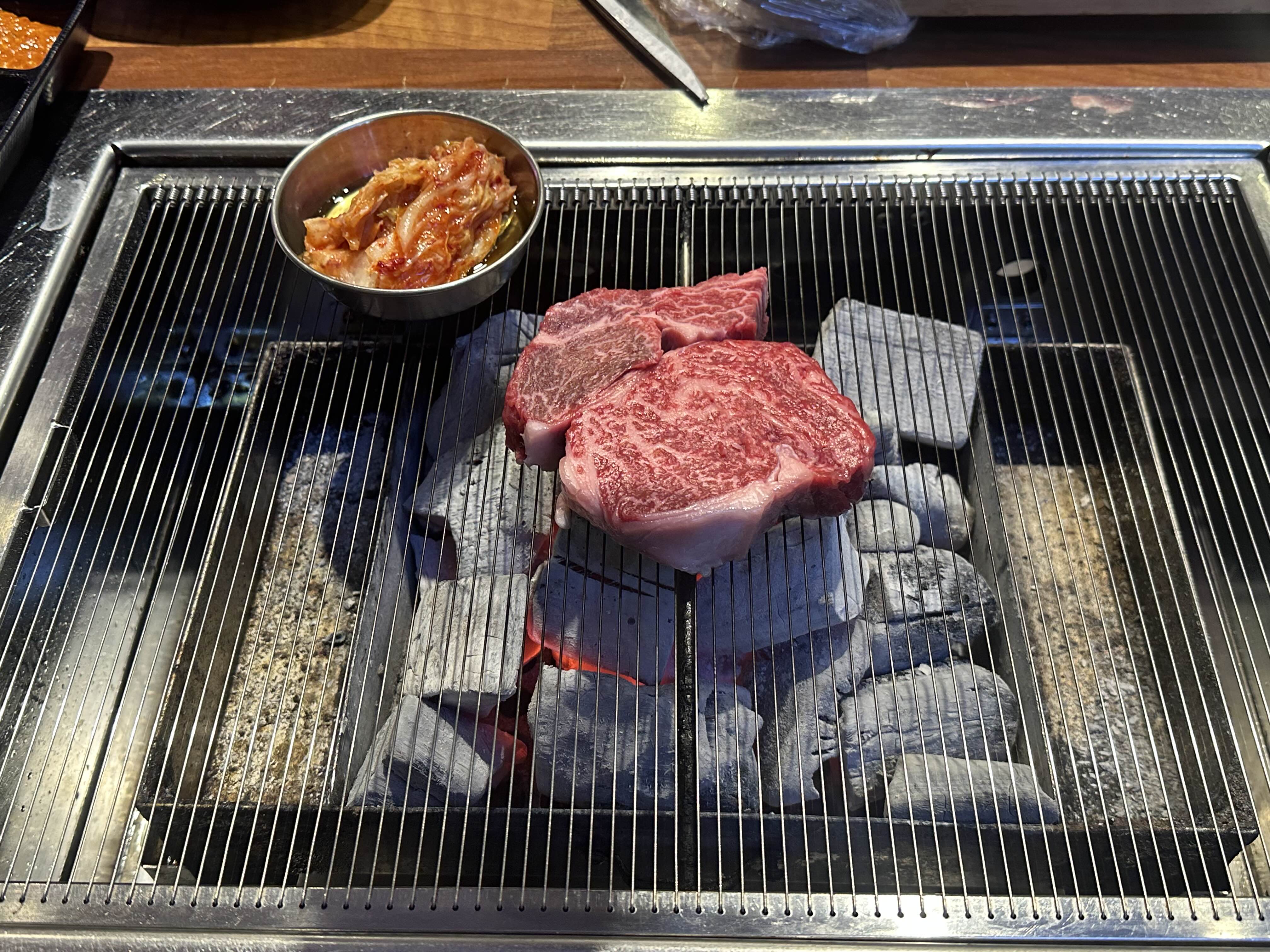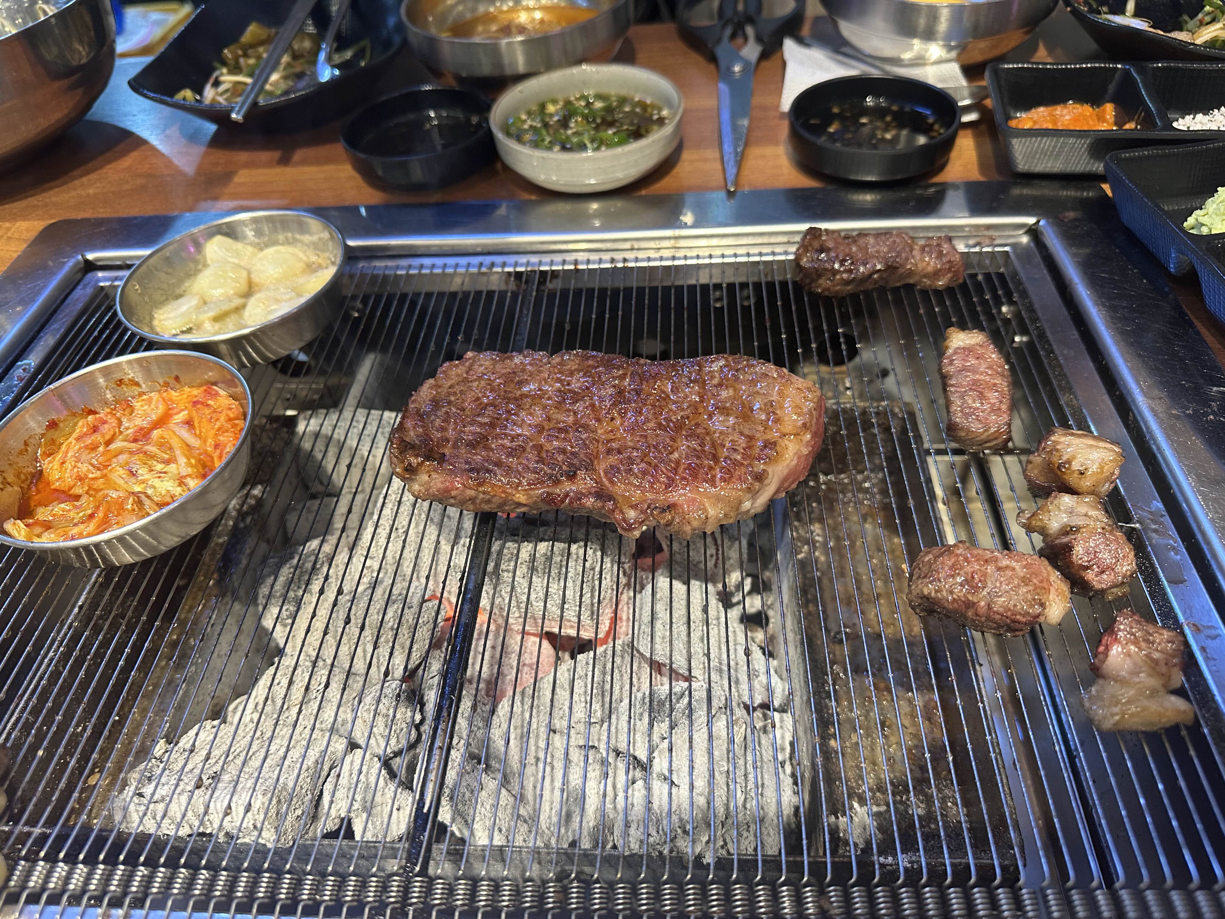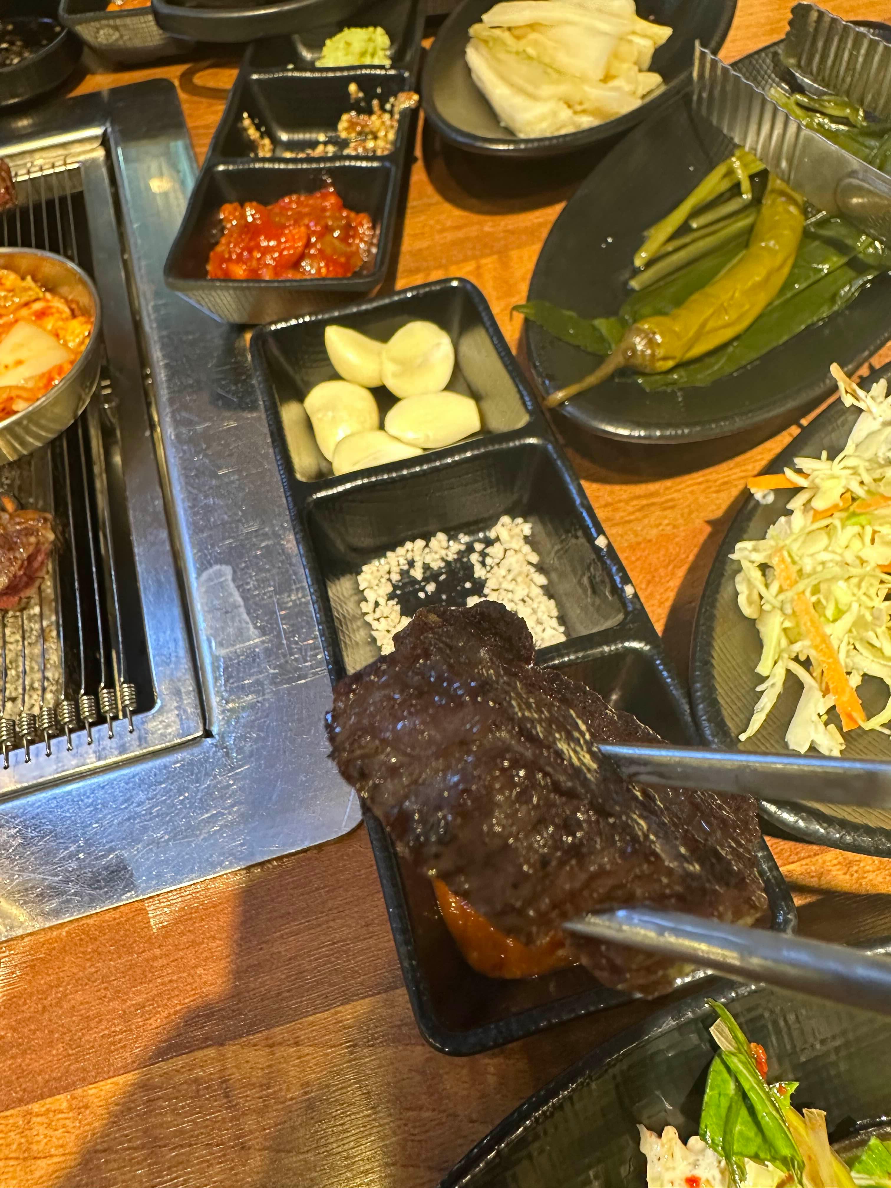 잘 구워진 고기입니다 두툼하죠?? 사실 사진 찍다가 불에 겉에가 살짝 탄 고기의 표면이지만 안에는 미디엄으로 부더러운 상태였습니다. 그리고 위쪽 오징어 젓갈이 소고기의 느끼함도 잡아주고 잘 어울렸습니다