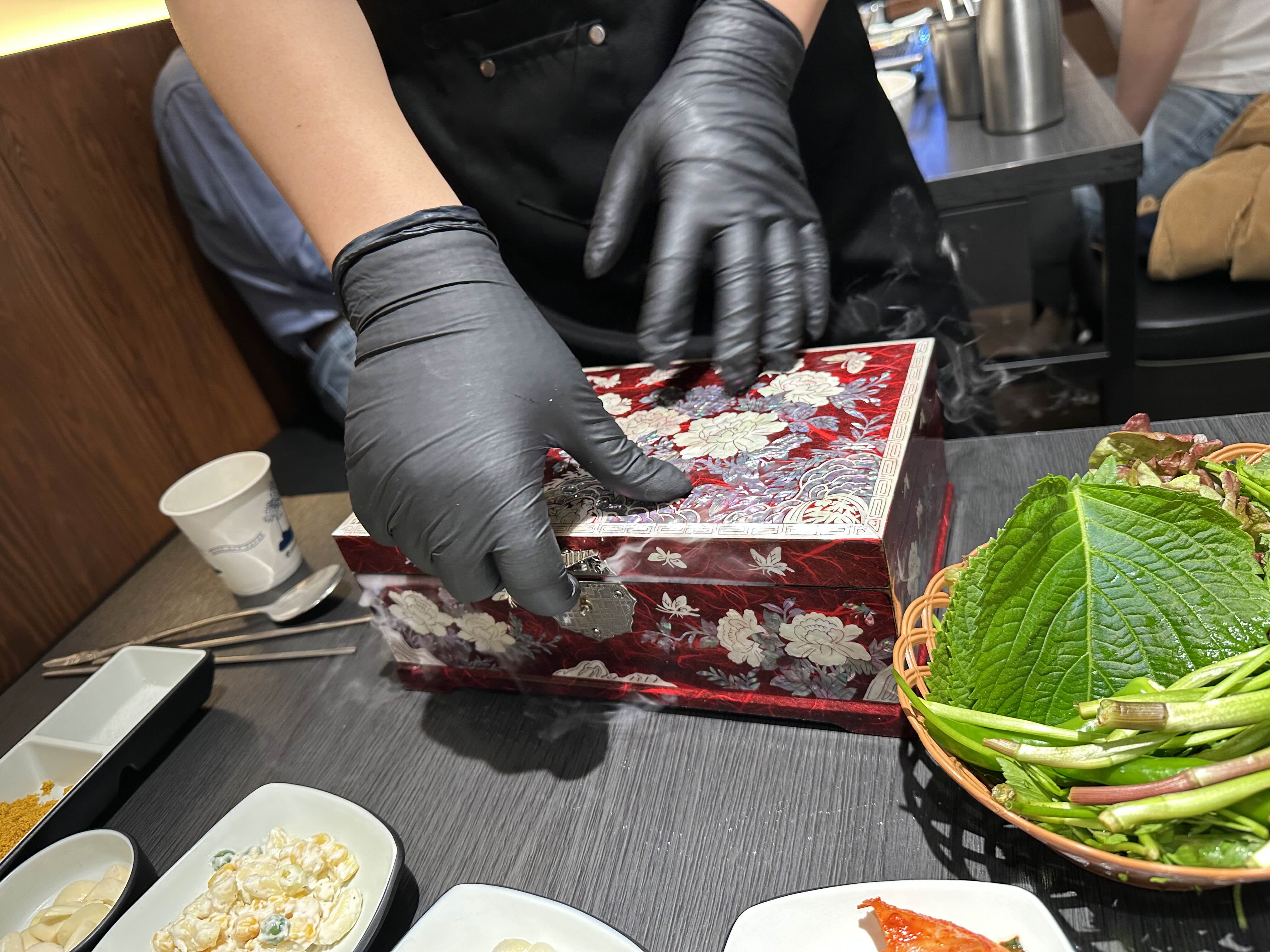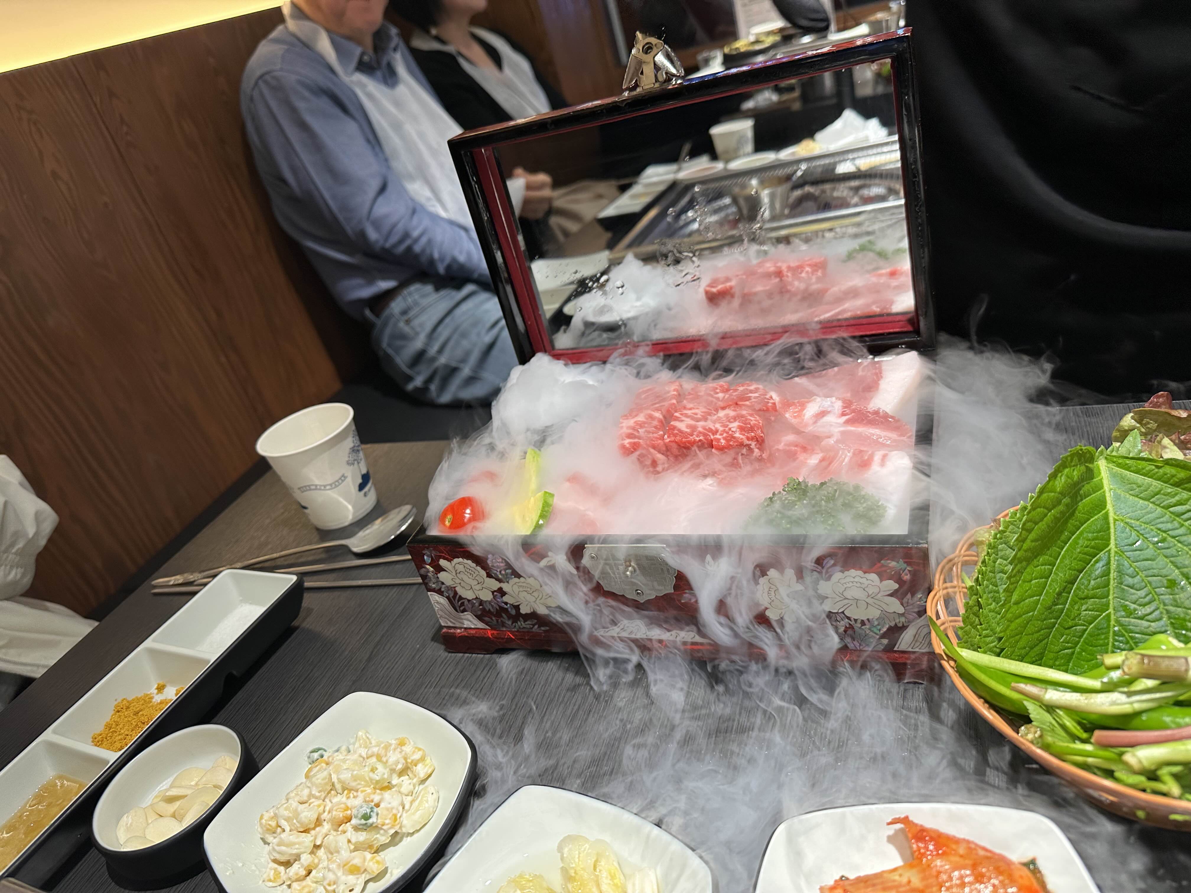 저희는 “모듬(2~3인) + 눈꽃소고기” 를 시켰고요, 모듬고기를 시키면 고급스러운 상자에 담아 주는 것 같습니다. 저 상자가 열리면서 드라이아이스 기체가 나오고 그 안에 고기가 보관되어 있습니다