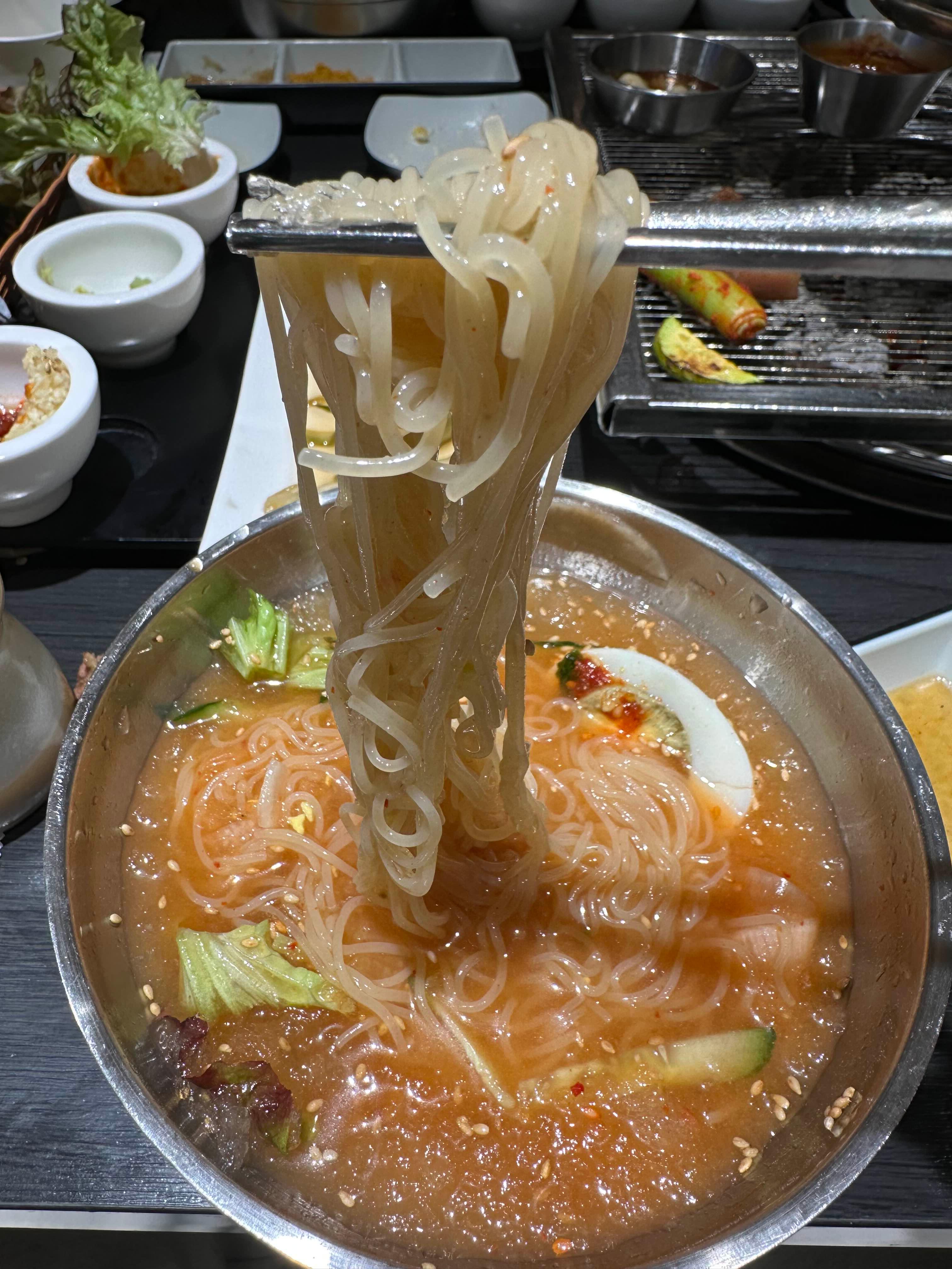 한 젓가락 후루룩 ㅎㅎ 고기의 느끼함을 쫙 잡아주는 밀면이었습니다