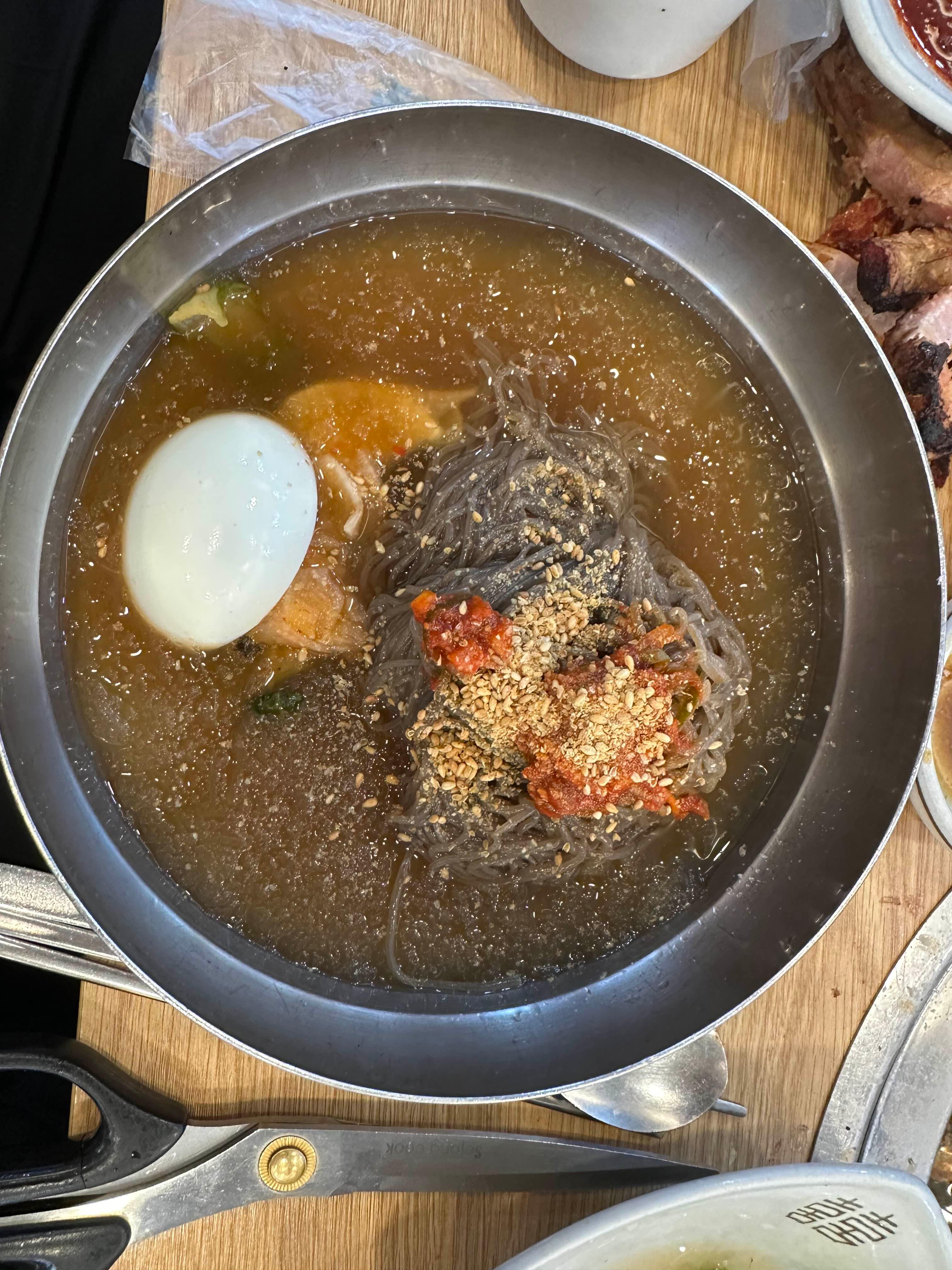 저는 고기의 느끼함을 잡아주기 위해 물냉면을 시켰죠 ㅎㅎ 물냉면은 보통 수준의 맛이었습니다. 어딜 가나 비슷비슷하죠 ㅎㅎ