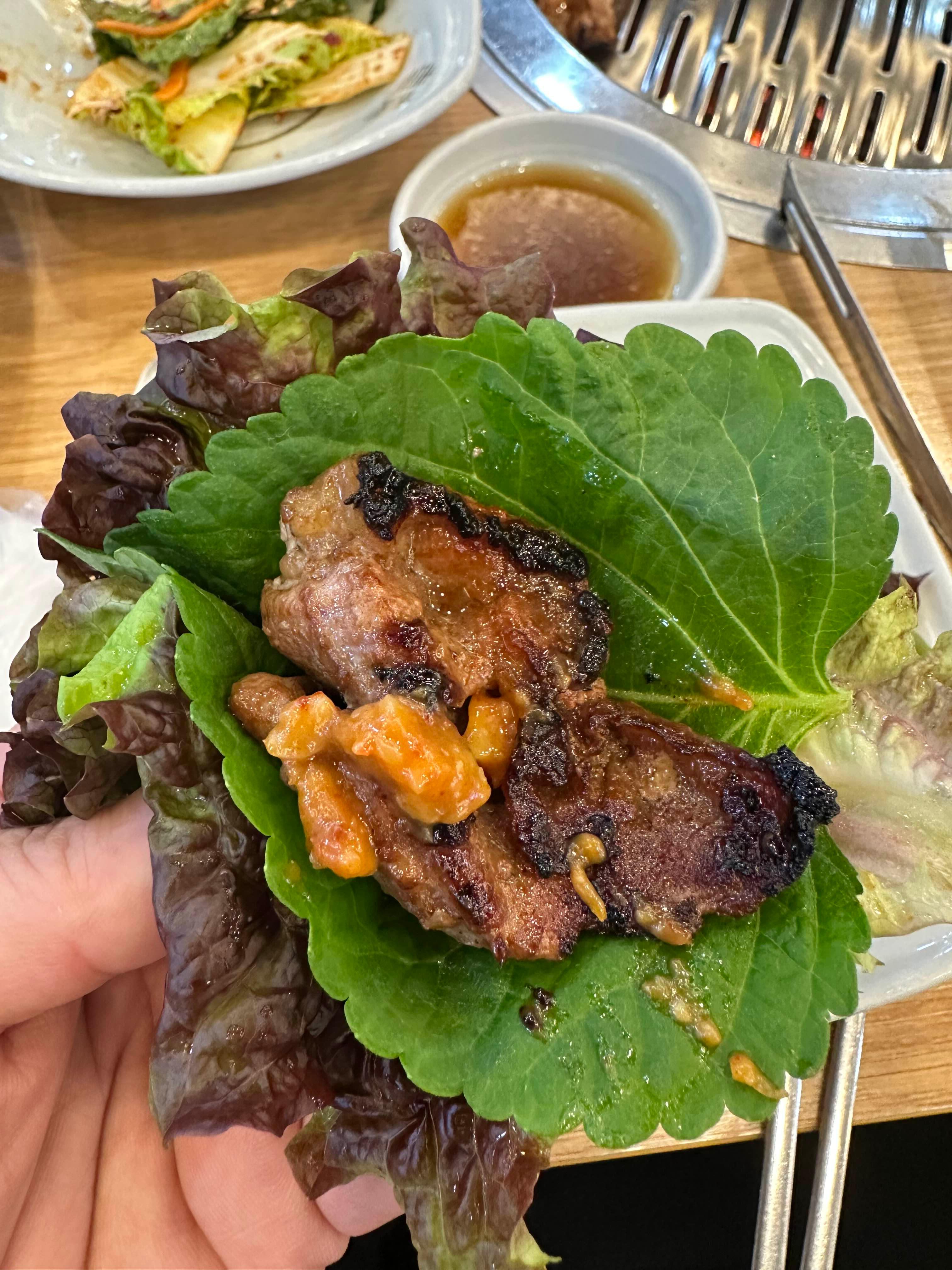 자 열심히 구웠으니 깻잎과 상추 포함해서 한쌈... 고기가 지방이 없어서 뻑뻑할 줄 알았는데 부드러웠습니다. ㅎ