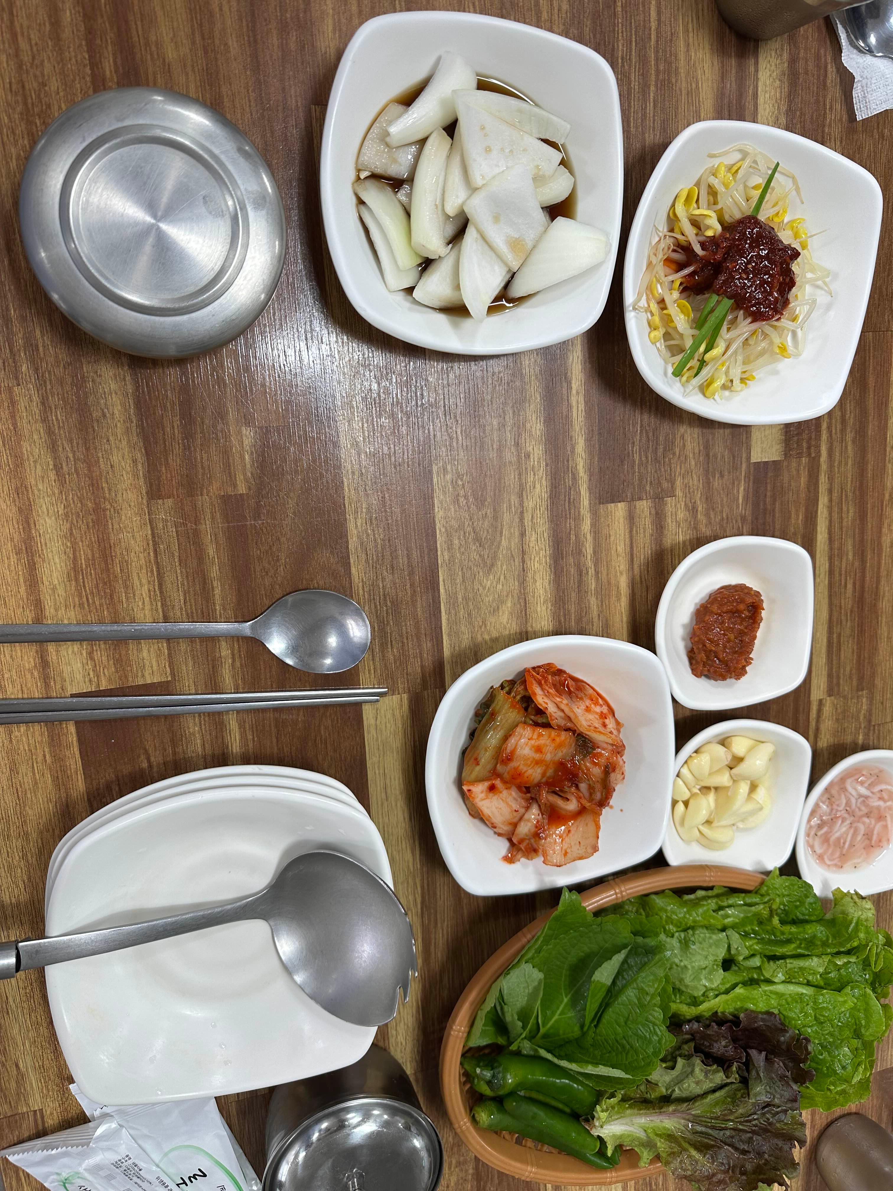 기본 반찬입니다 떡만둣국 칼국수 수육 이렇게 시켰고요 먼저 밑반찬이 나왔습니다. 메뉴별로 공기밥 한개씩 기본으로 나오네요