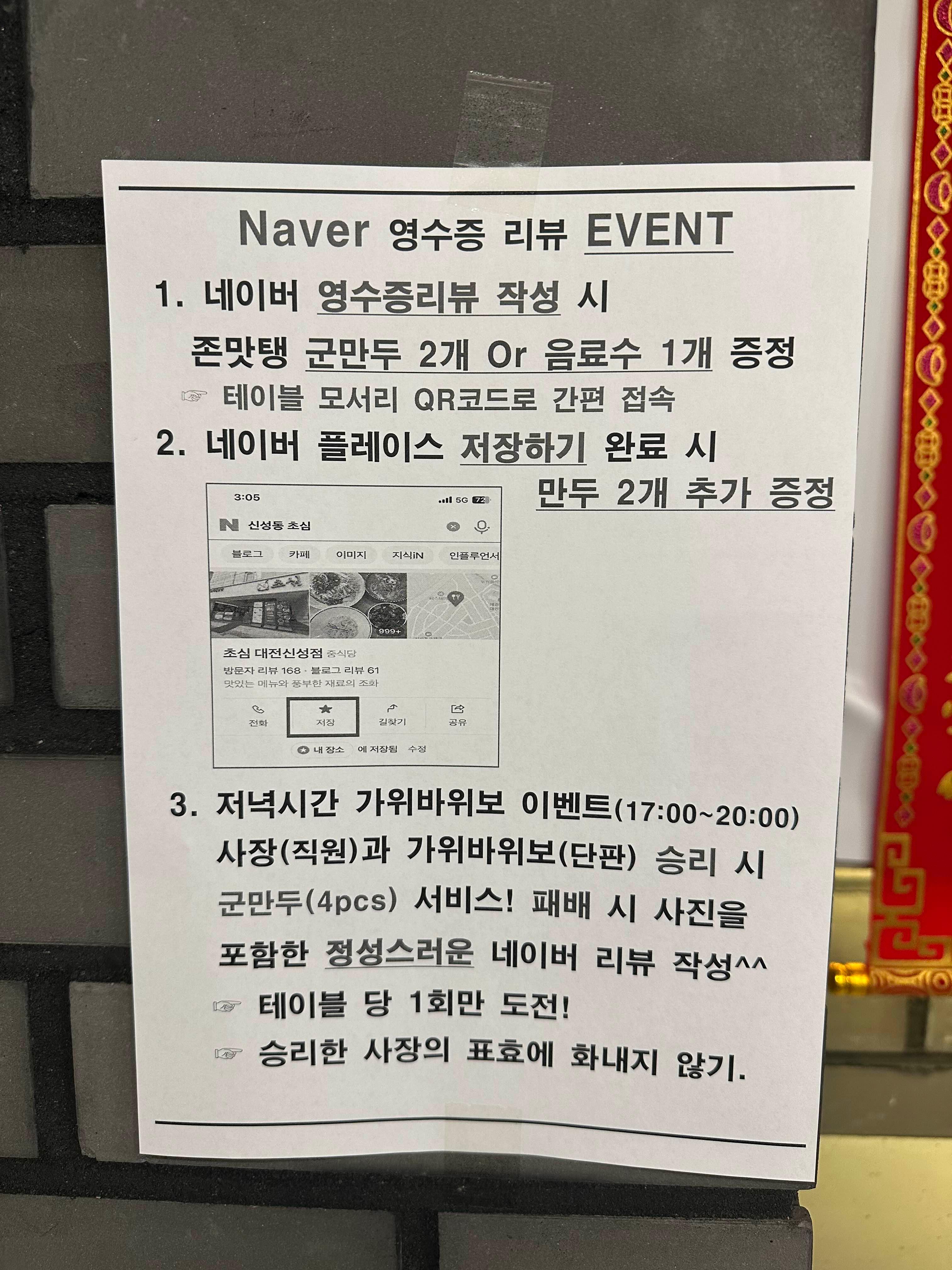 영수증 리뷰와 네이버 플레이스 저장하면 군만두나 음료수 주네요 ㅎㅎ 메뉴 기다리며 이벤트 참여하고 군만두로 주문