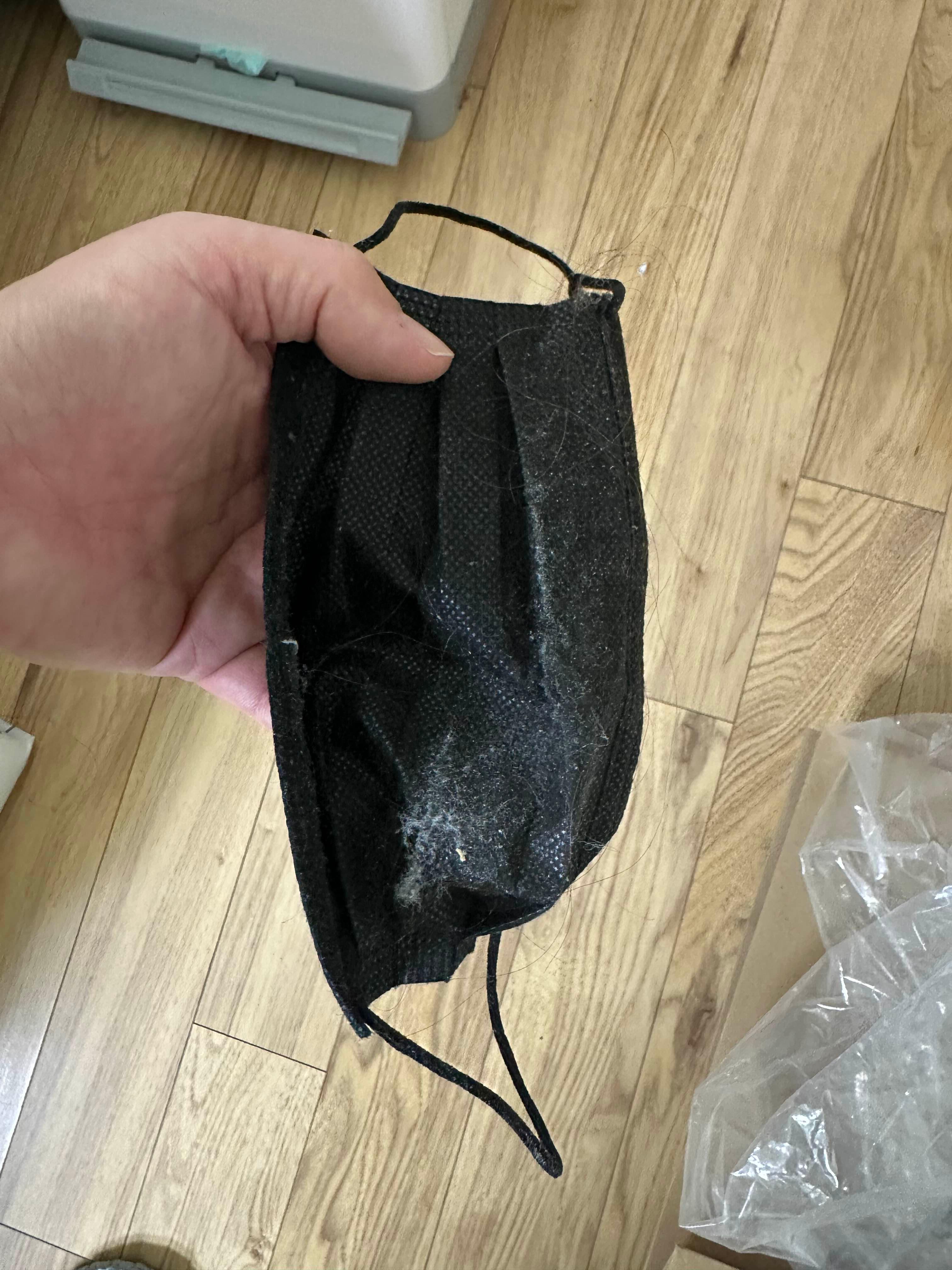 우리 집이 먼지가 많은 건지 마스크의 효능이 우수한 건지 애매하긴 한데요 ㅎㅎ 더군다나 검은 마스크라 먼지가 더 도드라지게 붙는 느낌입니다.