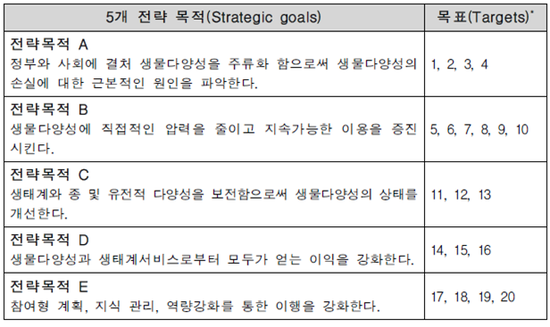 '아이치 목표'(Aichi Target·2011∼2020) 국제적으로 추진할 생물 다양성 보전 목표 및 이행방안을 담은 전략