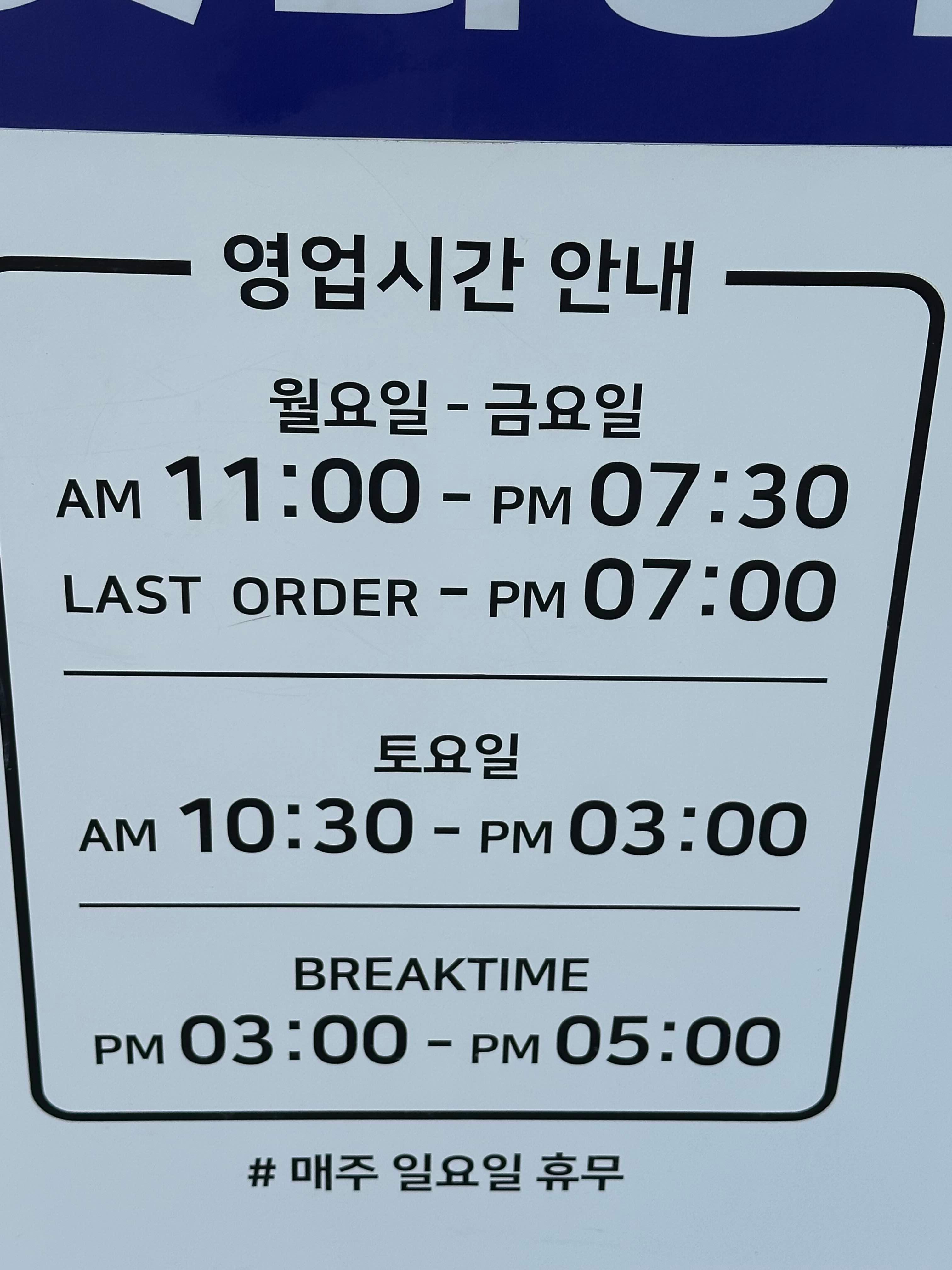 식당 영업시간입니다. 매주 일요일은 휴무이오니 참고하세요