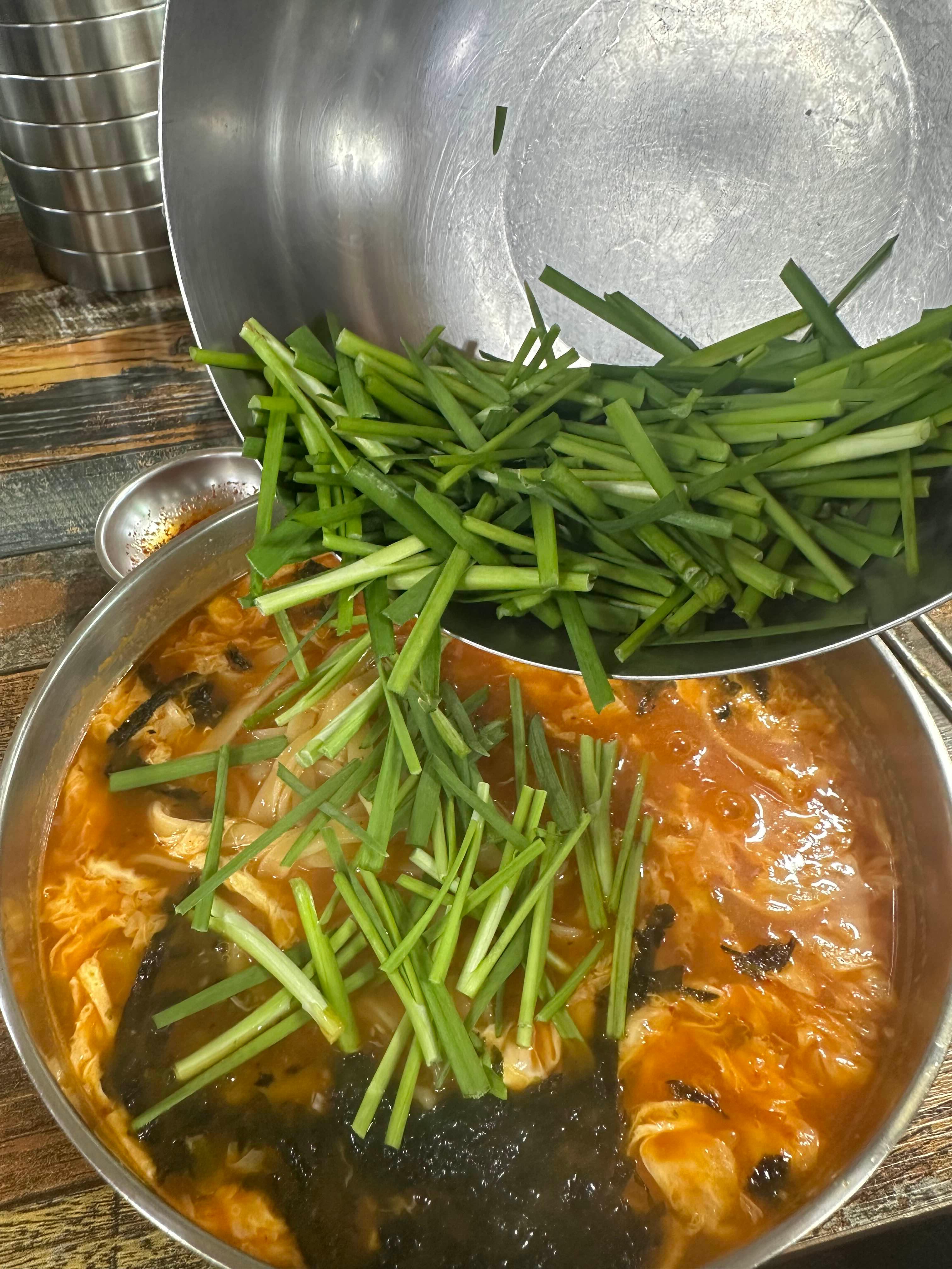 부추를 듬뿍 넣어 줍니다 부추가 숨이 죽어서 같이 먹으면 식감이 좋습니다