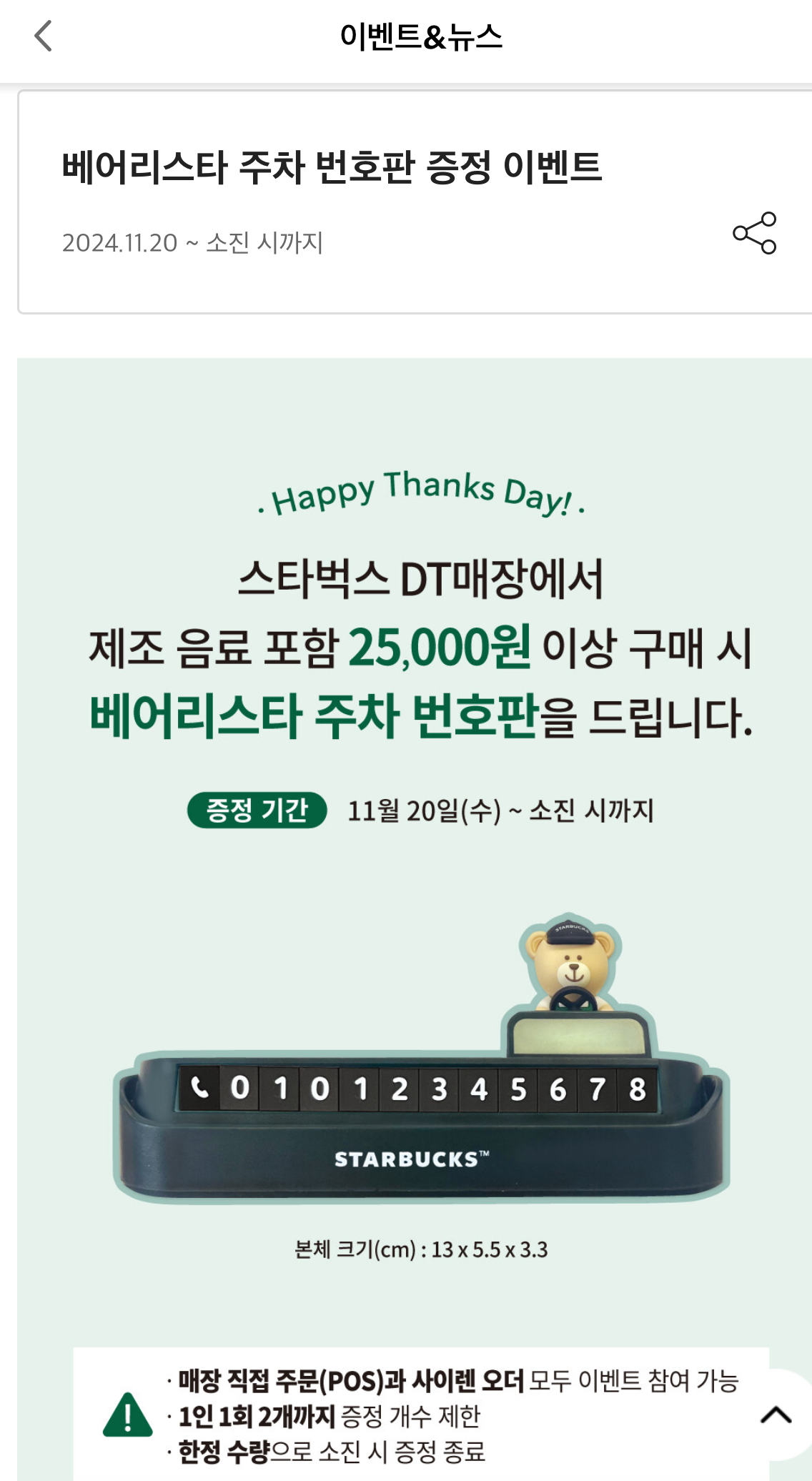 안녕하세요 오늘은 스타벅스에서 25,000원 이상 구매 시 베이트리 주차 번호판을 주는 이벤트가 있어서 참여해 보았습니다