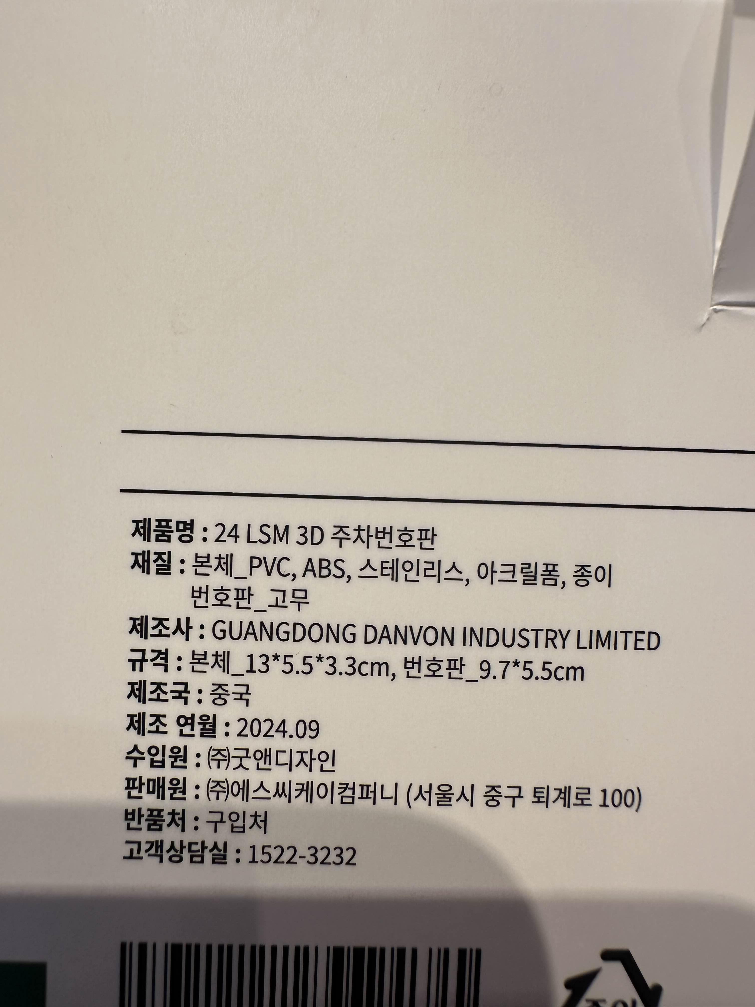 주차번호판 상세 제원입니다(중국산이네요 ㅎㅎ)