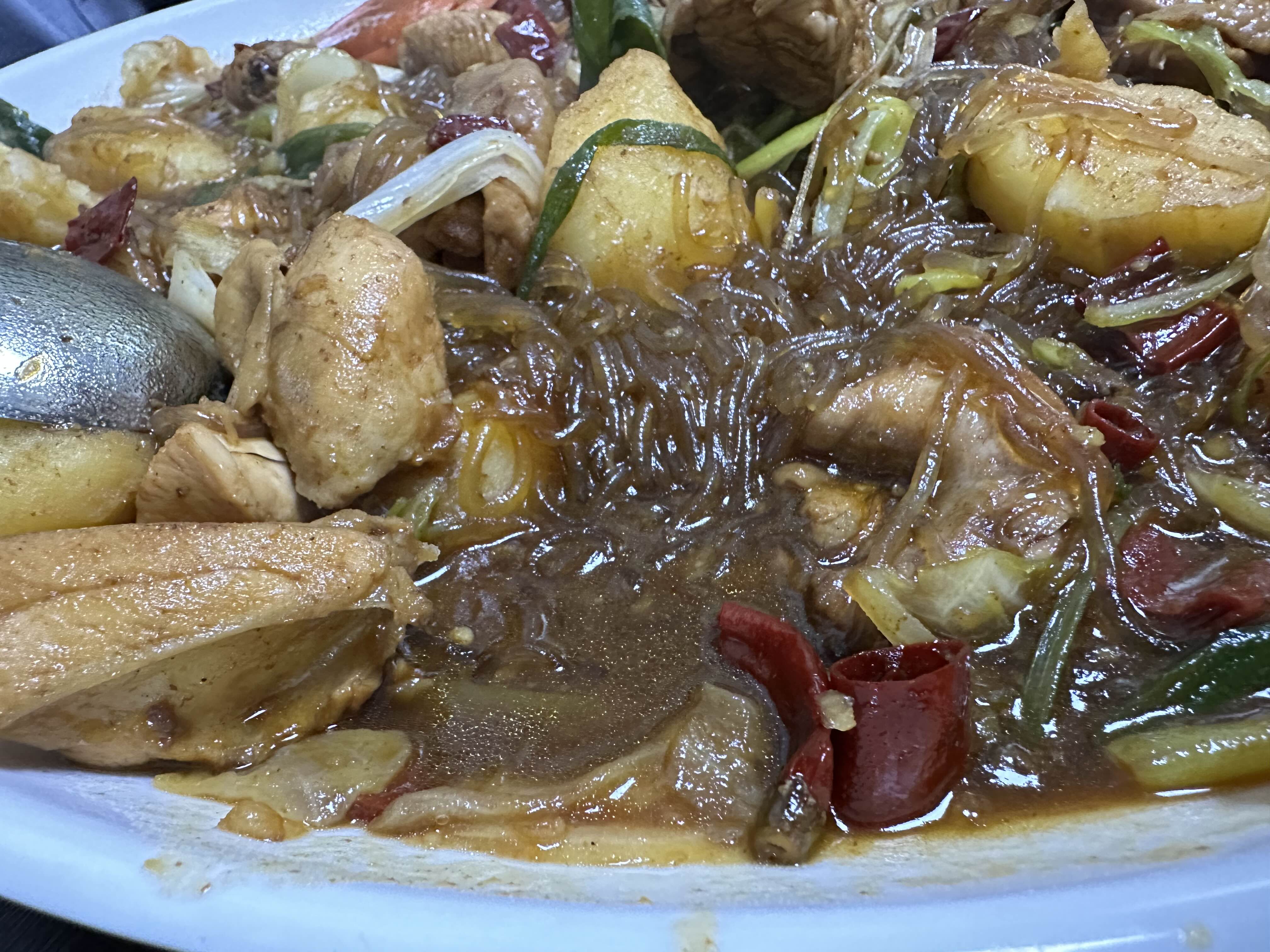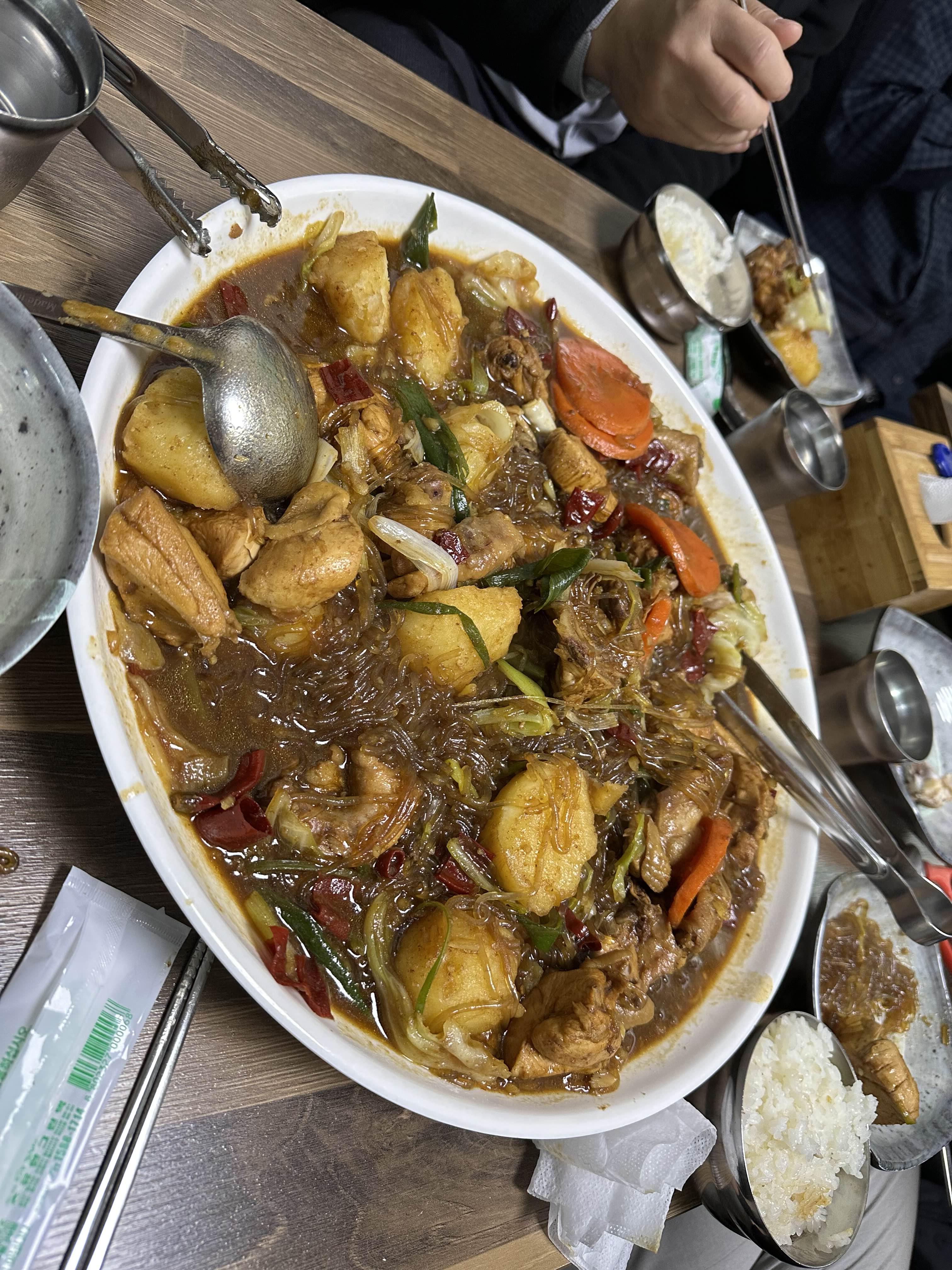 저희는 남자 4명이어서 찜닭 한마리반짜리 주문 ㅎ 너무 배고파서 먹는 도중 사진을 찍었네요 짬조름한 국물에 같이 비벼 먹으니 궁합이 잘 맞습니다 페어링 좋아요 ㅎ