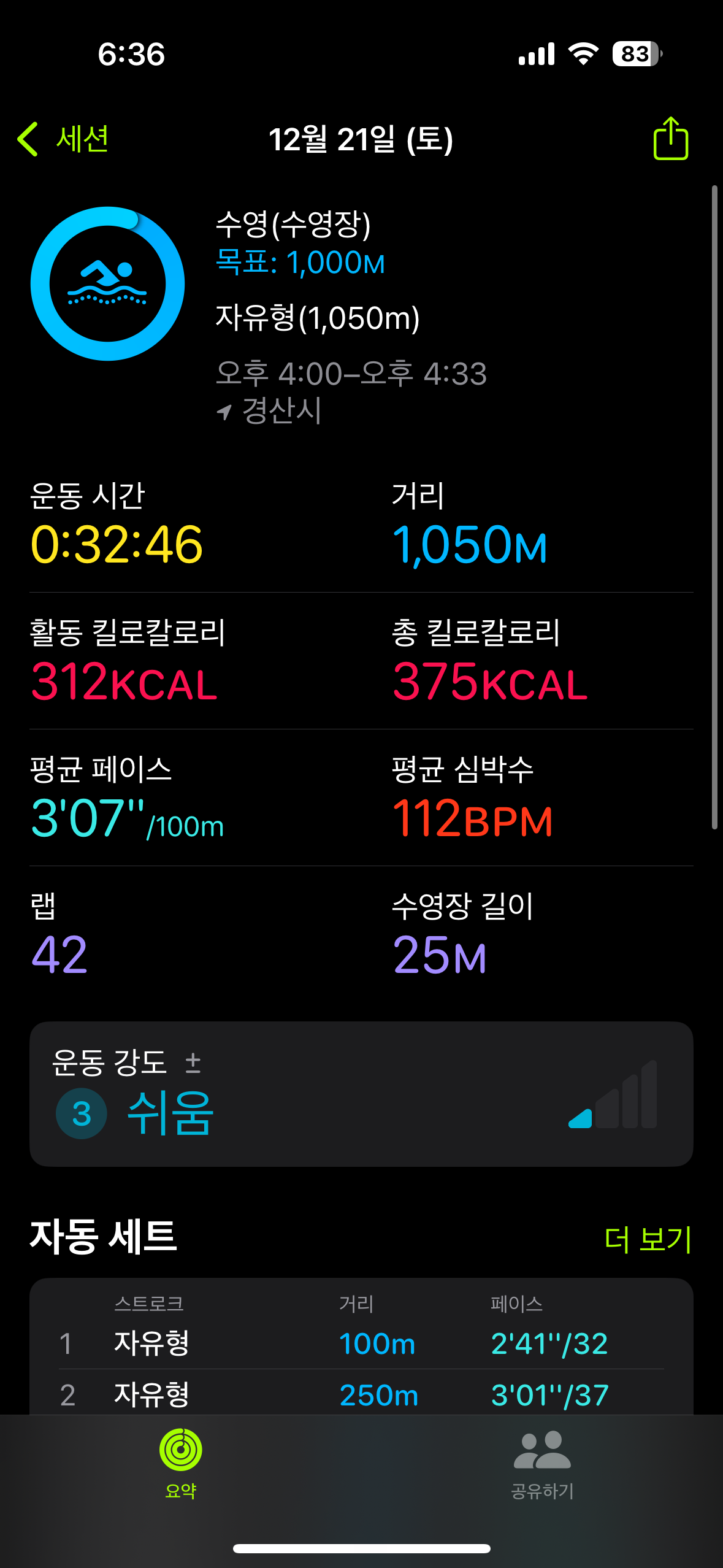 제가 수영하는 템포가 느려서 그런지 심박수가 안 오르더라고요.. 힘은 든데.. 머리가 띵할 정도인데 심박수가 110이라니 ㅠㅠ 더 강하게 스트로크 하면 길게 못 갈 것 같고요.. 예전에 강습받을 때 강사님이 팔 스트로크 빨리 하라고 했는데 제 템포랑은 안 맞더라고요 ㅎㅎ