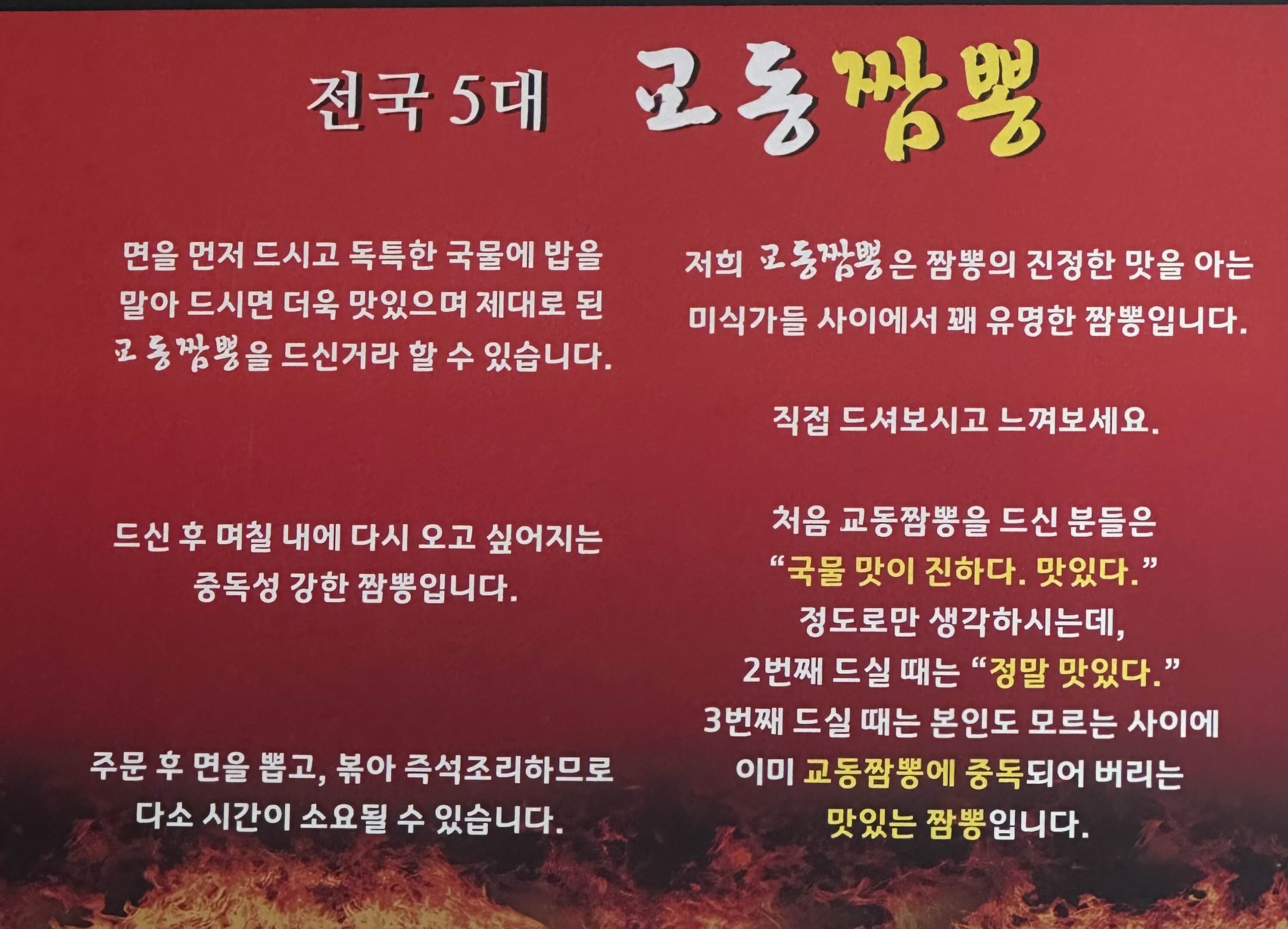 전국 5대 짬뽕인 교동짬뽕... 전국에 교동짬뽕이 많은데 뭐가 교동짬뽕인지를 모르겠습니다(스타일이 다 다른 느낌), 면을 먼저 먹고 국물에 밥을 말아먹으면 더욱 맛있다고 하고 중독적인 맛이라고 합니다
